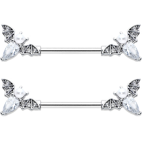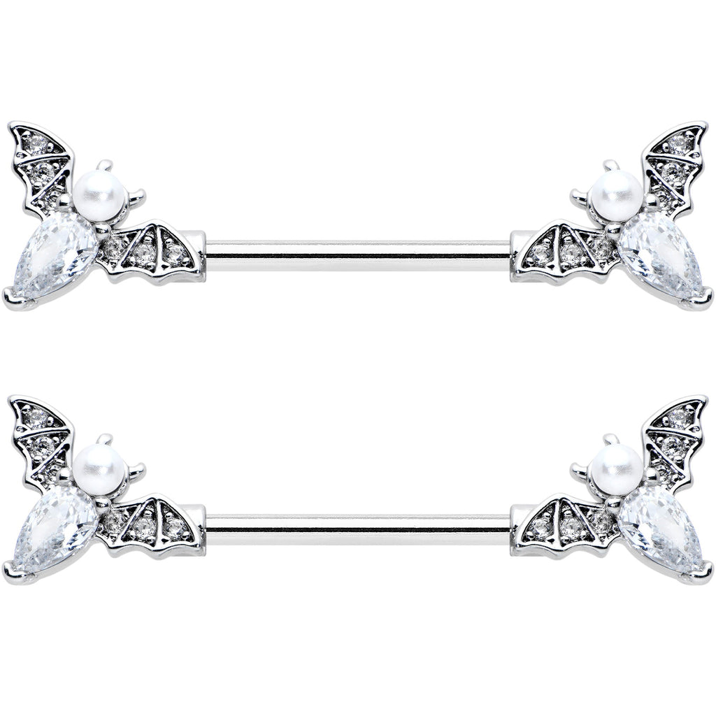 Let your piercings soar through the night skies like the bat on this 14 gauge nipple jewelry! It's made with 14mm durable 316L surgical grade stainless steel straight barbells. The ends feature bat charms with their wings set with small clear gems. The bat's body is a single oval clear gem while its head is a white pearlescent orb. They're perfect for Halloween or to accessorize any gothic aesthetic. You're bound to be besotted with these Halloween bats! Sold as a set of two.Specifications