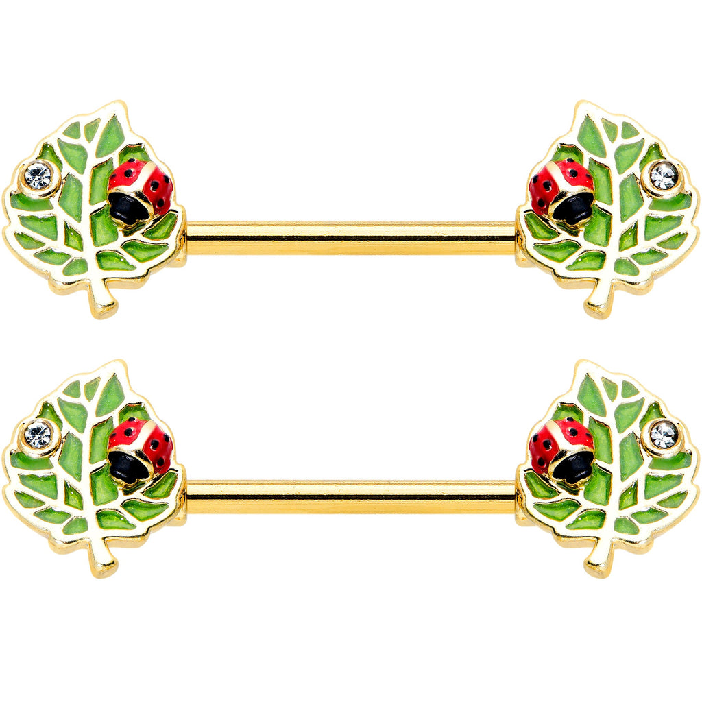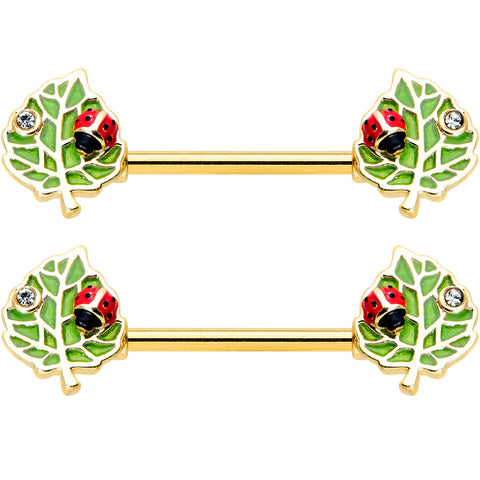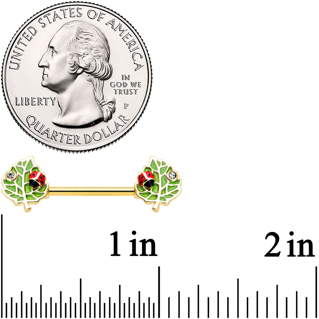 14G 9/16 Clear Gem Gold Hue Leafy Ladybug Barbell Nipple Ring Set