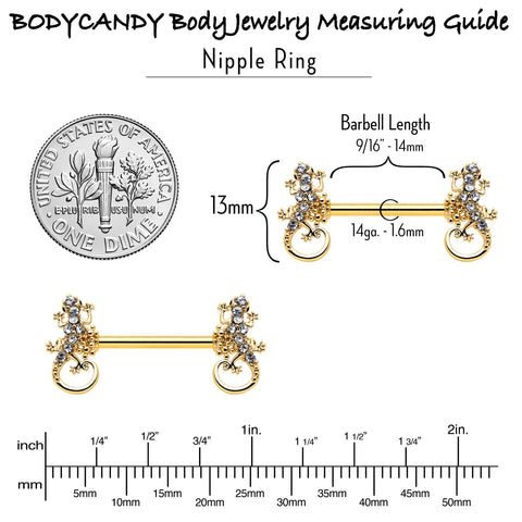 You can rock some reptiles when you are wearing this 14 gauge nipple jewelry. It is made with 14mm gold tone PVD over 316L surgical grade stainless steel straight barbells. Each of the ends feature lizard charms, with textured detailing. The lizards are also embellished with clear gems for a look of luxury that you cannot help but love. Whether you are a classy chameleon or a gorgeous gila monster, you are sure to adore these reptile nipple piercing rings. Sold as a set of two.