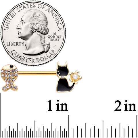 14G 9/16 Clear Gem Gold Tone Fish Black Cat Barbell Nipple Ring Set