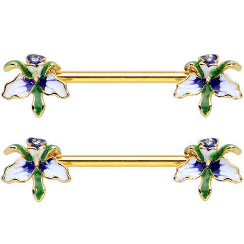 Let every day feel like Springtime when you're rocking this 14 gauge nipple jewelry! it's made with 14mm gold tone PVD over 316L surgical grade stainless steel straight barbells. Each of the ends features an iris flower charm, inlaid in purple and white. They're further embellished with green leaves and are each set at the top with a clear gem for added style. Your look is going to blossom with these fantastic, floral nipple piercing rings! Sold as a set of two.Specifications