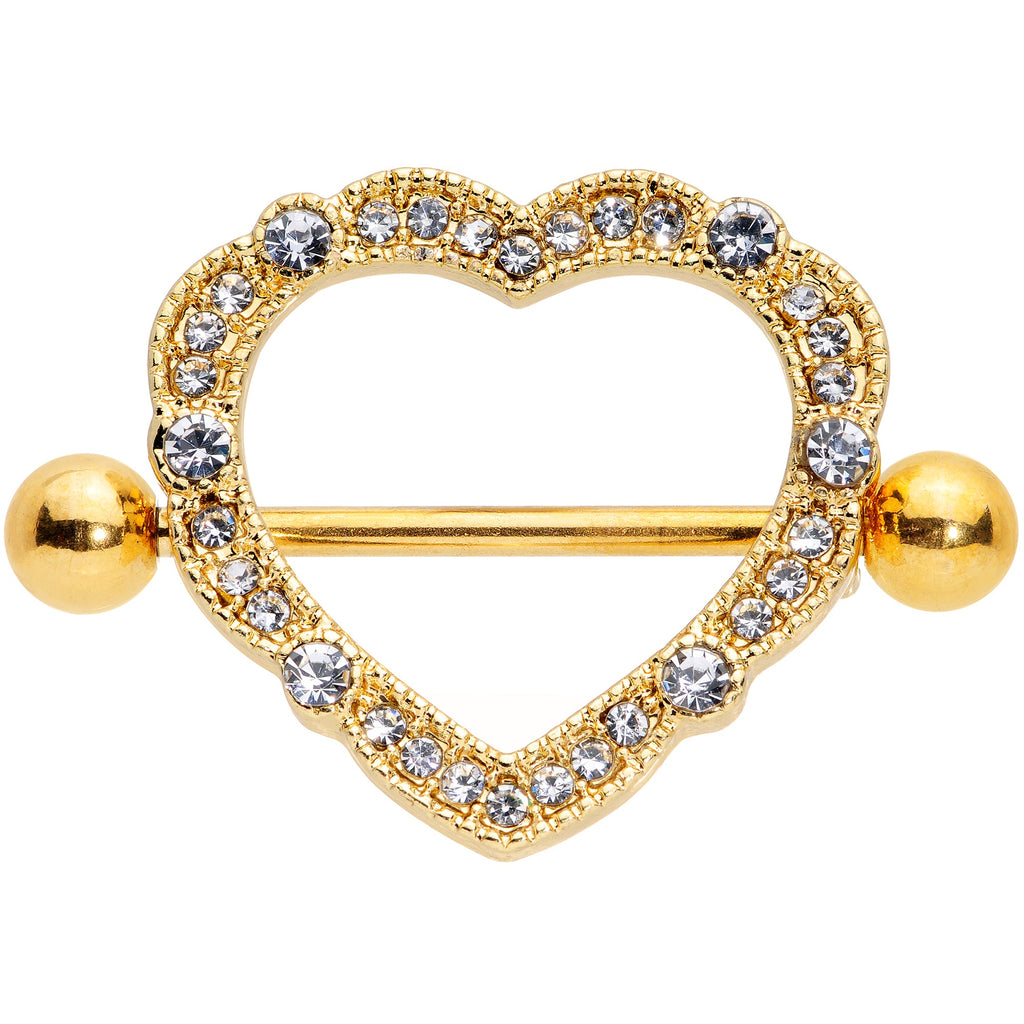 Keep your piercings close to your heart with these 14 gauge nipple shields! They're made with 14mm wearable length gold tone plated over 316L surgical grade stainless steel straight barbells with a total length of 7/8" and 5mm ball ends and feature heart shield charms with clear gems. With their classic symbols of love and their snazzy, showy style, this nipple jewelry definitely emphasizes how you feel about your nipple piercings this Valentine's Day! Sold as a set of two.Specifications