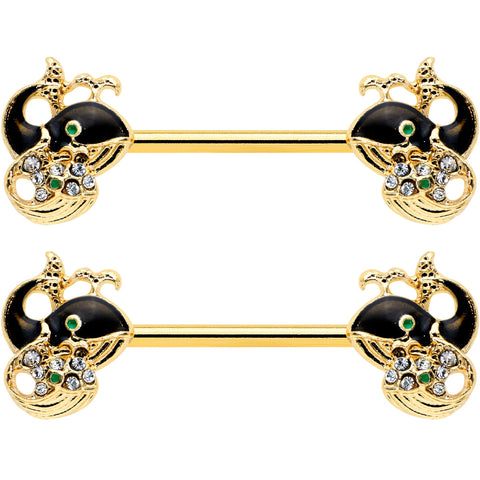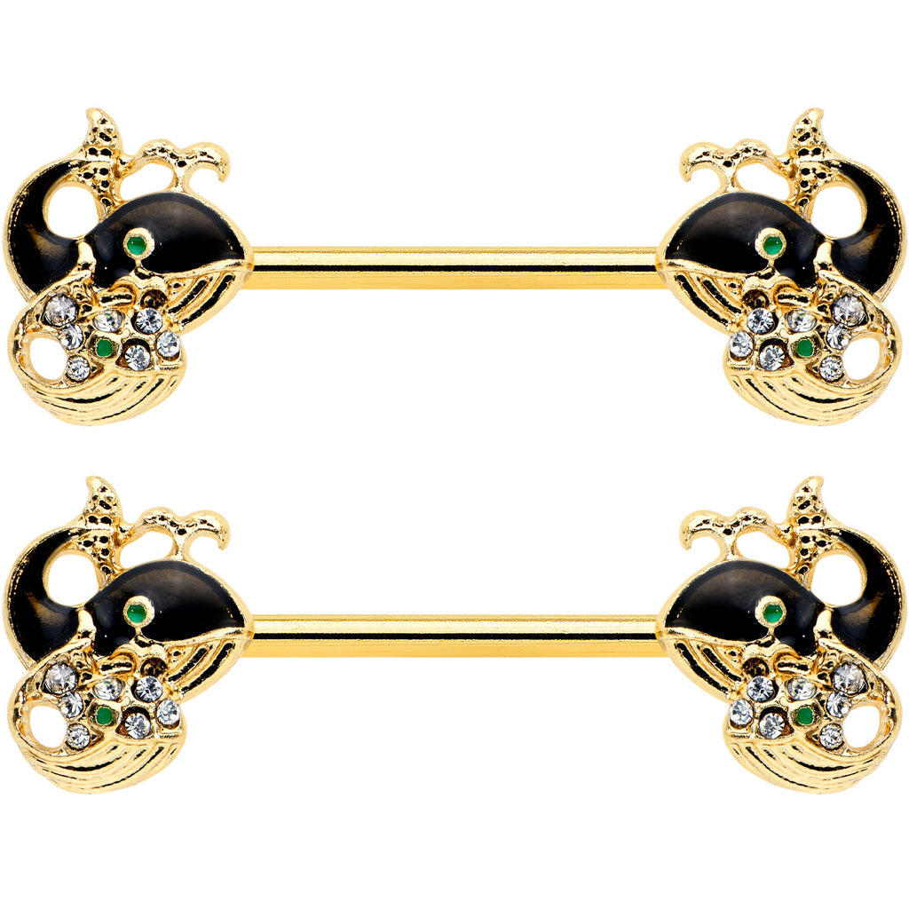 The whales on this 14 gauge nipple jewelry show that style runs in the family! It's made with 14mm gold tone PVD over 316L surgical grade stainless steel straight barbells. Each of the ends features a whale charm, with a mother whale and baby. The mothers have black embellishment and a green eye while the babies are set with clear gems and also have a green gem eye embellishment. Show your love for these gorgeous creatures family-style with these wonderful whale-themed nipple piercing rings! Sold as a set of two.Specifications