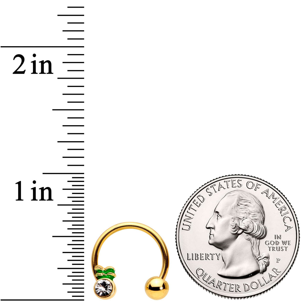 These are pineapple rings - but nothing like the kind you get in a can! These 14 gauge horseshoe rings are 14mm and made with gold tone plated over 14mm 316L surgical grade stainless steel circular rings. They have a 5mm ball end on one side and on the other, a pineapple! The body of the pineapple is a clear gem and the leaves are inset with green color for added detail and visual interest. If you're really hating the winter cold, pop a pair of pineapples in your piercings. They're guaranteed to banish the blahs! Sold as a set of two.Specifications