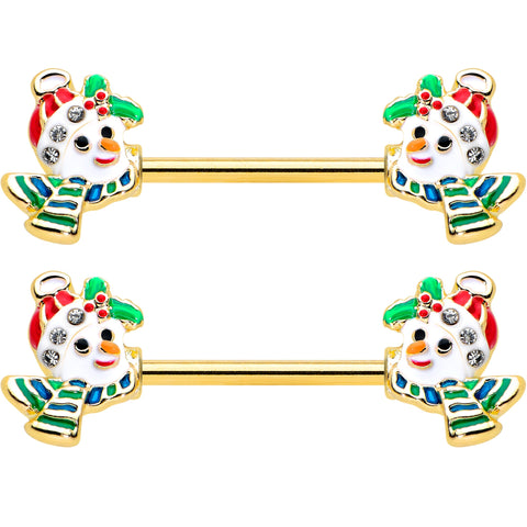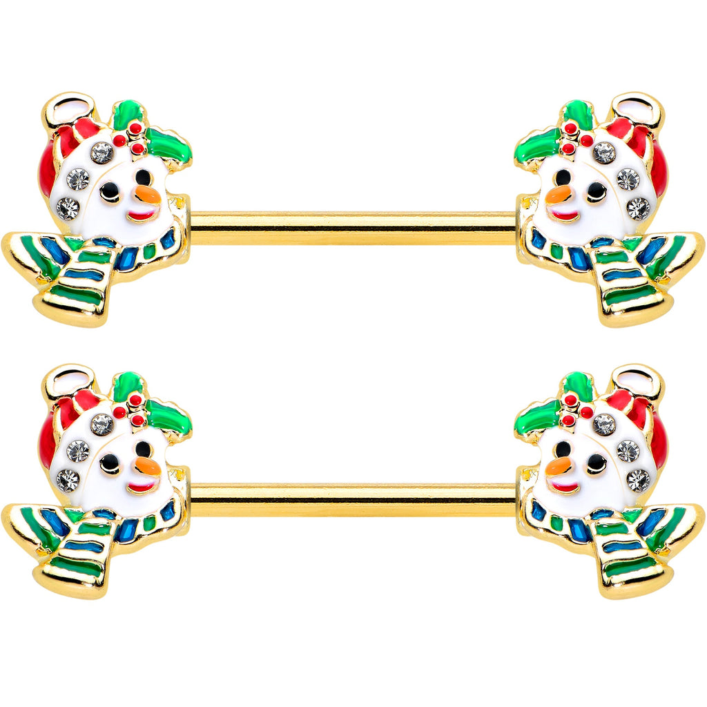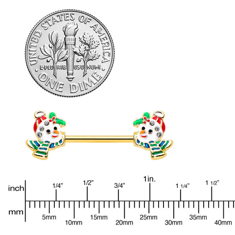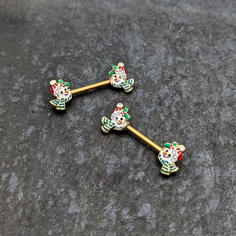 14G 9/16 Clear Gem Gold Tone Snowman Christmas Nipple Ring Set