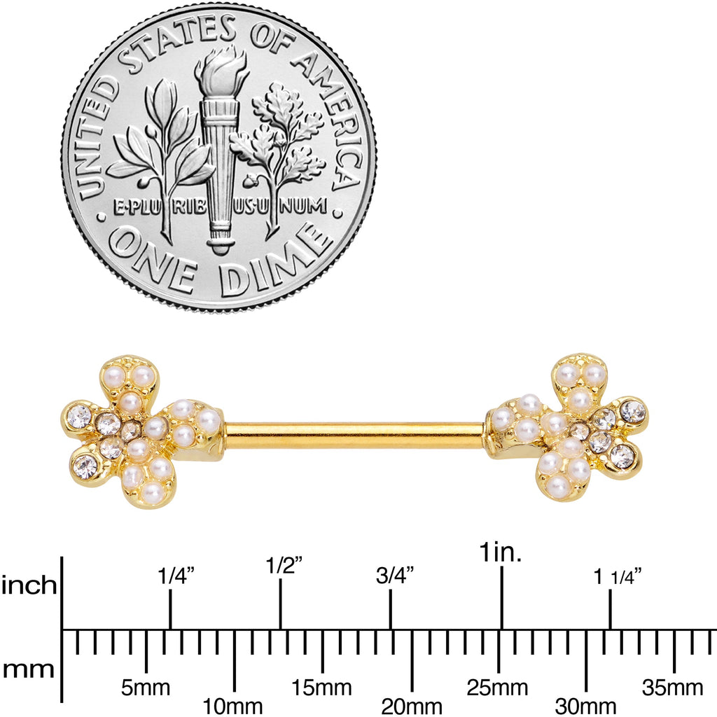 The splatter on this 14 gauge nipple jewelry is one you won't be in a hurry to mop up! It's made with 14mm gold tone PVD over 316L surgical grade stainless steel straight barbells. Each of the ends features a whimsical splat charm, set with white orbs on one side and with clear gems on the other. With their charming shape, luxe detailing, and clever design, these are some splats that are sure to suit any style! Sold as a set of two.Specifications