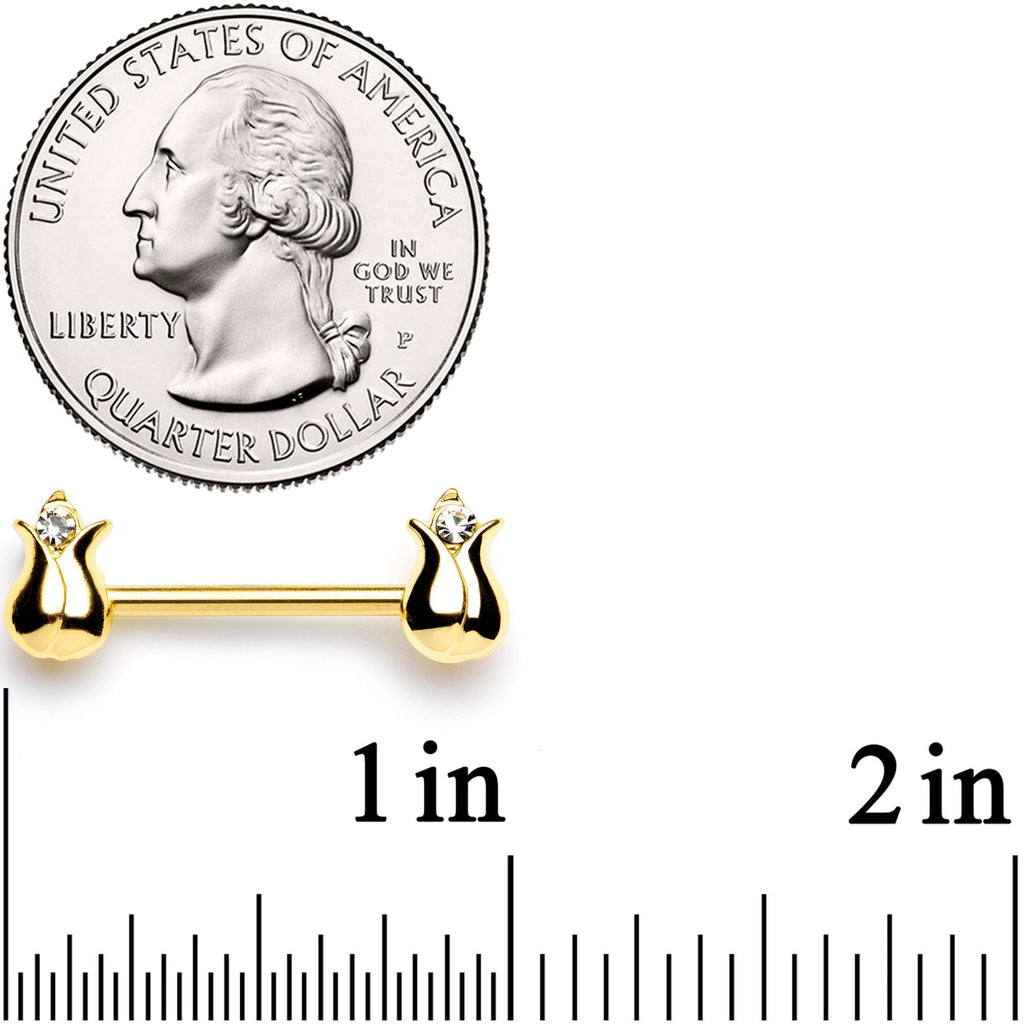 14 Gauge 9/16" Clear Gem Gold Tone Tulips Barbell Nipple Ring Set