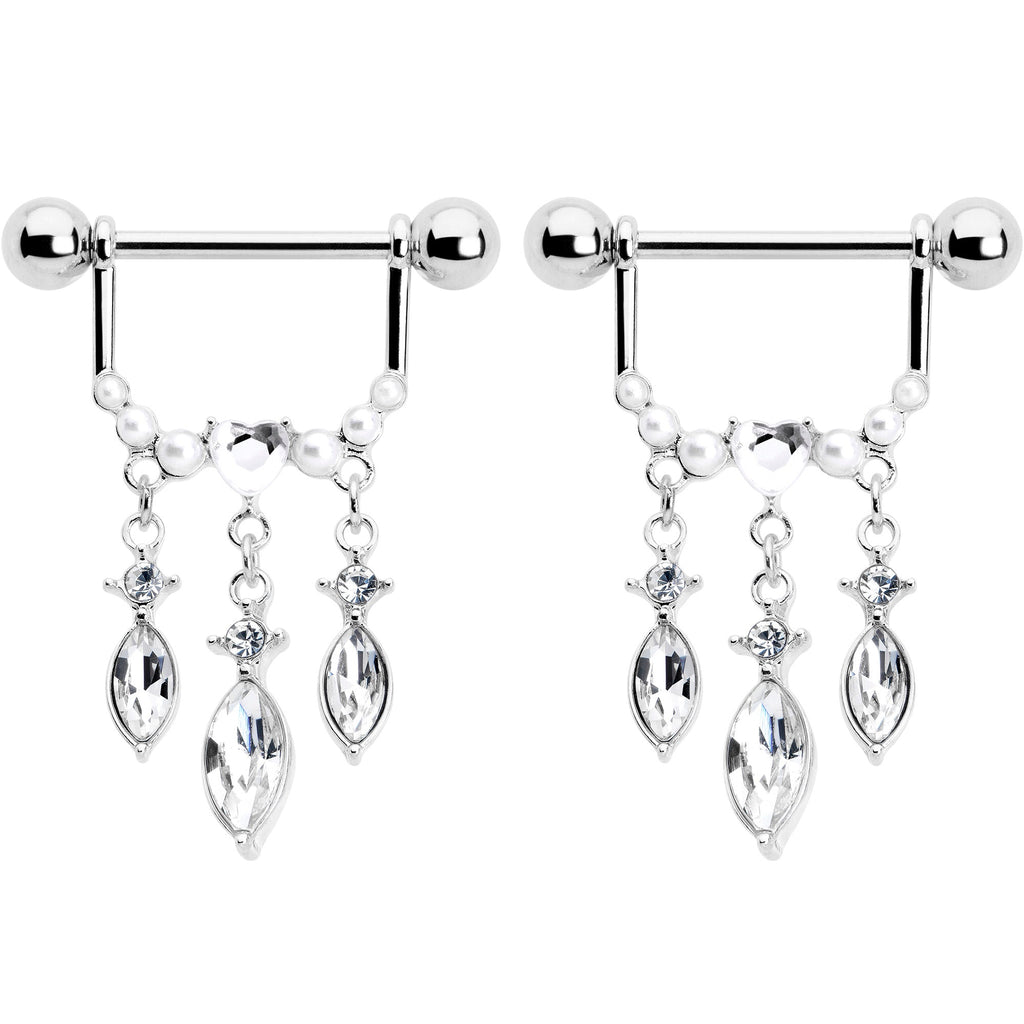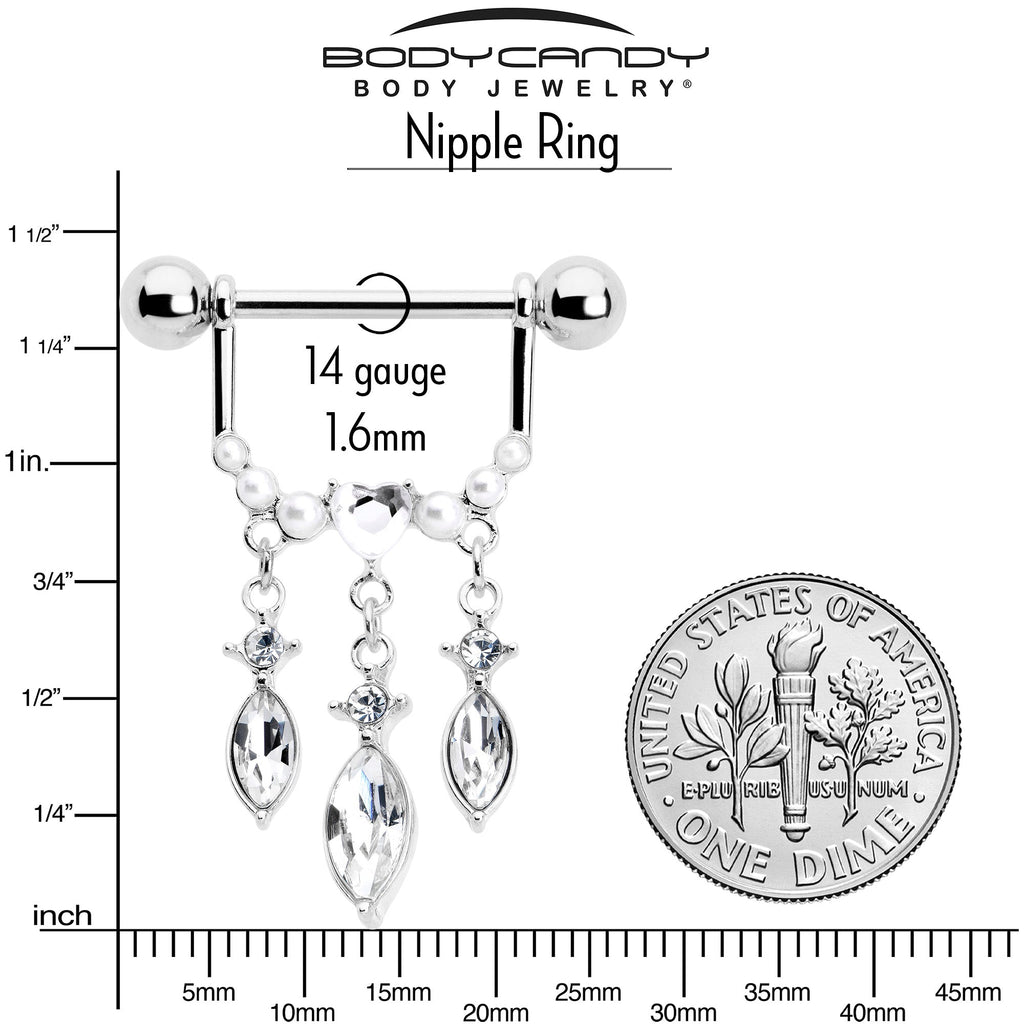 Triple the impact with this super luxe 14 gauge nipple jewelry. It's made with 14mm durable 316L surgical grade stainless steel straight barbells with 5mm ball ends. Each one supports a row of of faux pearls with a clear gem heart in the center. Hanging beneath is a triple row of drop-shaped clear gem dangles. Turn up the volume on style with these ultra opulent nipple piercing rings. Sold as a set of two.Specifications