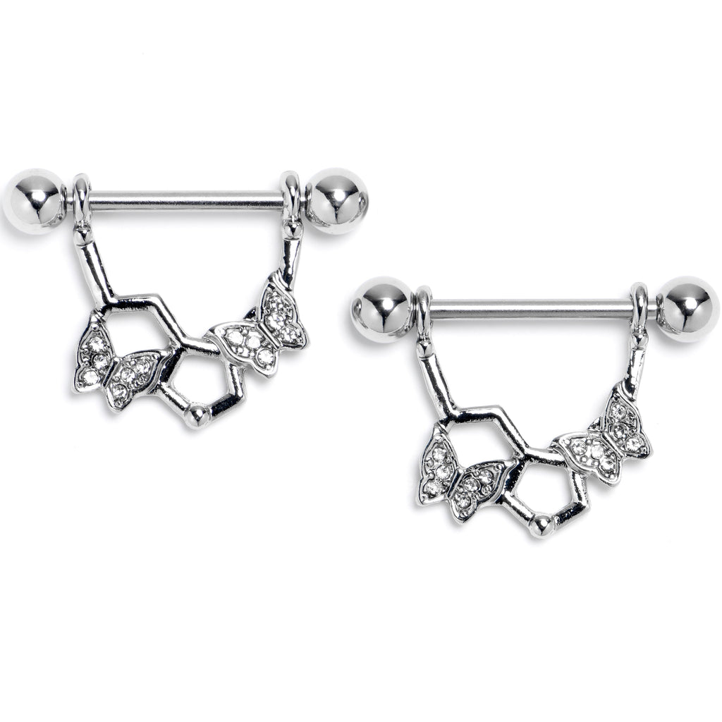 Get hexy with the butterflies on this 14 gauge nipple jewelry. It is made with 14mm durable 316L surgical grade stainless steel straight barbells with 5mm ball ends. Each one features a dangling portion composed of hexagon-shaped sections. They are each flanked by butterflies, with clear gems set in their wings. Get glam with geometry with these stylish butterfly nipple piercing rings. Sold as a set of two.Specifications