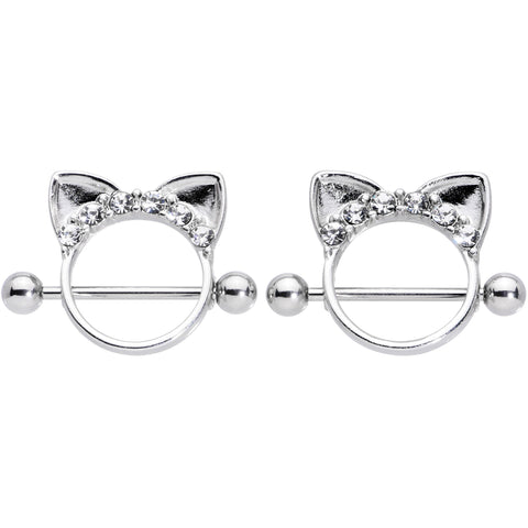 Here's a pair of kitties to make your nipple piercings pretty, on these 14 gauge nipple shields! They're made with 14mm wearable length 316L surgical grade stainless steel straight barbells with 5mm ball ends. The barbells have a total length of 3/4". The shield portion features a fashion-forward feline theme, with cat ears on the top. The ears are embellished with a row of clear gems for an added touch of glamour that every cool cat and kitten can appreciate! Give your nipple piercings the purr-fect look with this fabulous feline nipple jewelry! Sold as a set of two.