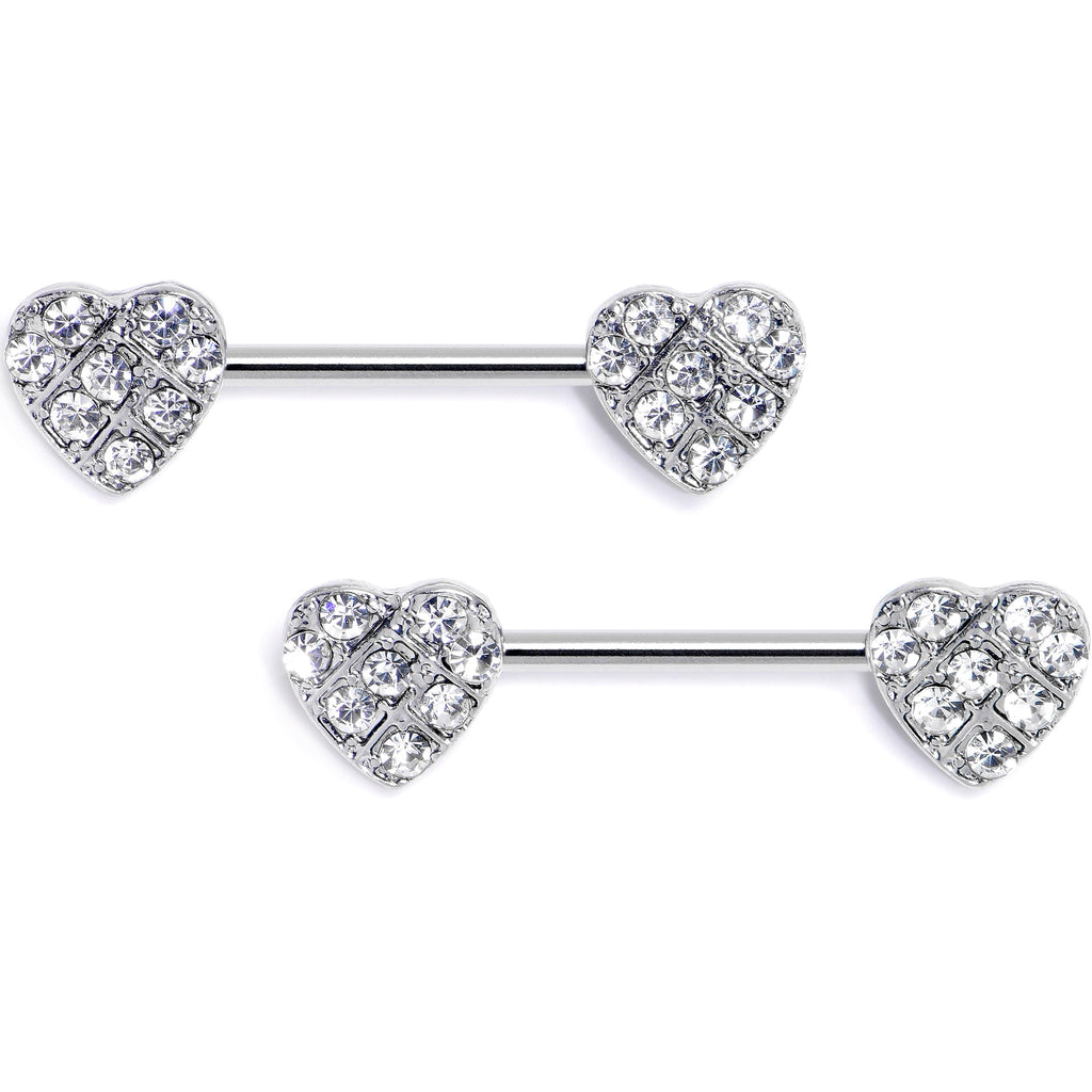 Get a luxe look of love with lattice this Valentine's Day with this 14 gauge nipple jewelry. It's made with 14mm durable 316L surgical grade stainless steel straight barbells. Each of the ends features a heart charm, with latticework detailing. Set in between each of the lines are clear gems for an added touch of style that really takes this look over the top. Fall in love with style when you're rocking these heart themed nipple piercing rings. Sold as a set of two.Specifications