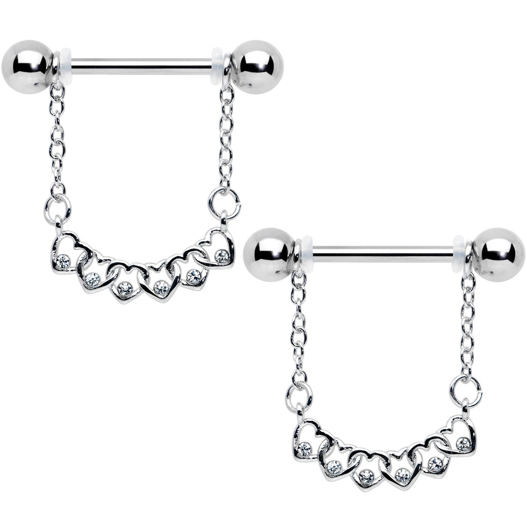 14 Gauge 9/16 Clear Gem Link Heart Valentine Dangle Nipple Ring Set
