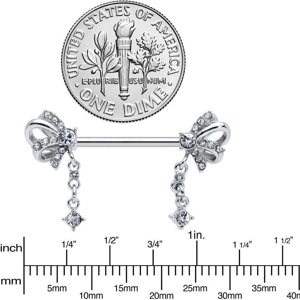 Simple style is simply stupendous on this 14 gauge nipple jewelry! It's made with 14mm durable 316L surgical grade stainless steel straight barbells. Each of the ends features one side of a bow charm, with criss-crossing loops, some of which are paved with clear gems and the rest are left unadorned for contrast. The bows are set with a clear gem at the center to give a coordinated look. Dangling from the bottom is a short length of matching chain, supporting one last clear gem. Wrap your look up with a bow with the simple style of these beautiful bow nipple rings! Sold as a set of two.Specifications