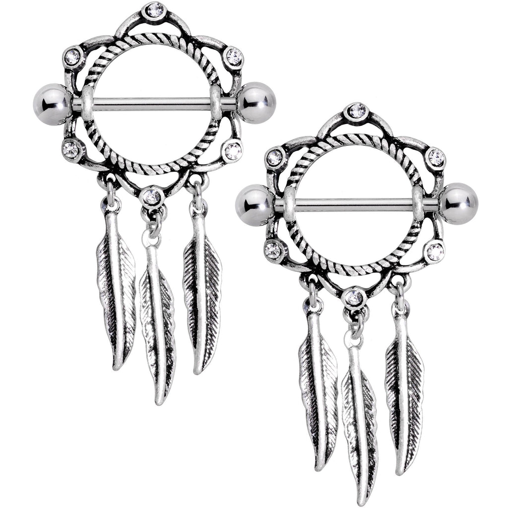 These 14 gauge shield nipple rings pack a lot of thoughtful detail into a small package. They're made with 14mm durable 316L surgical grade stainless steel straight barbells and have 5mm ball ends. The shield portions have a rise of 16mm and a width of 13mm. The shields have an inner circle with a twisted design that gives them depth and texture. The outer ring is shaped like a stylized lotus flower, embellished with small clear gems at each point. These highlight the delicately outlined shape and add visual contrast. Dangling from the bottom are three feathers, their movement drawing the eye and giving the shields a unified feel. If you want to give your piercings the total package, these shields are exactly what you're after. Sold as a set of two.