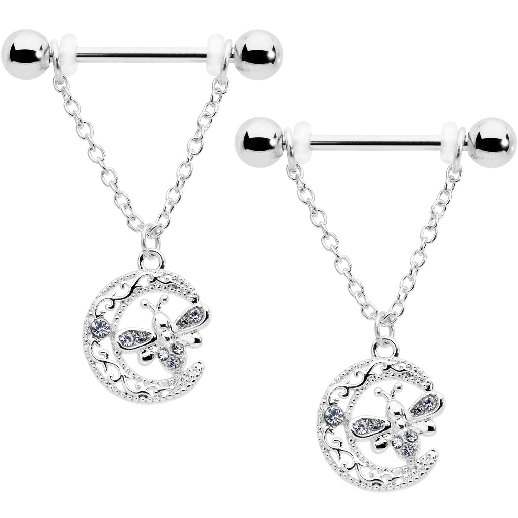 This crescent moon may be alone in the sky but it's got a friend on this 14 gauge nipple jewelry. It is made with 14mm durable 316L surgical grade stainless steel straight barbells with 5mm ball ends. Each barbell supports a matching length of dangling chain. Each chain features a crescent moon charm, embellished with filigree detailing giving them an airy appearance as well as clear gem embellishments. Set between the points of the moons are dragonfly charms, with clear gems in the wings and bodies. You'll want these nipple piercing rings to keep you company forever. Sold as a set of two.
