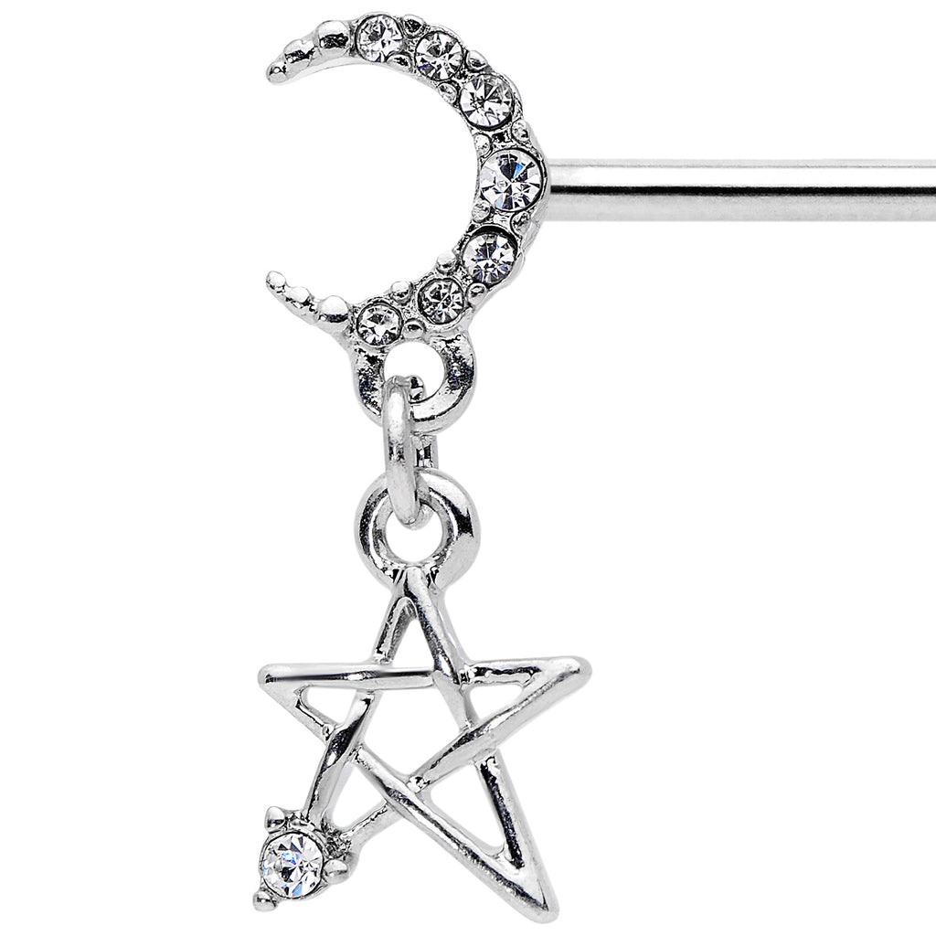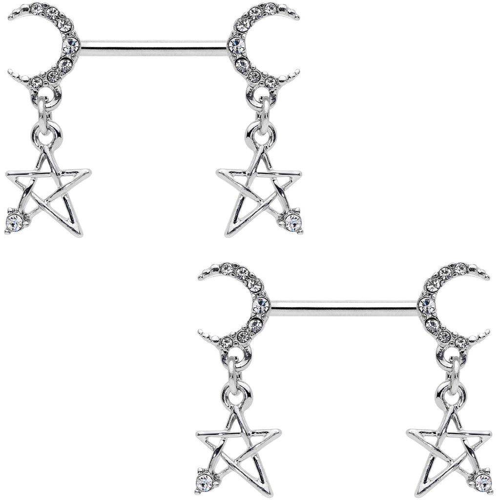 Now you can make moon magic and dance with the stars even during the day with this 14 gauge nipple jewelry! It's made with 14mm durable 316L surgical grade stainless steel straight barbells. The ends of each one feature a crescent moon, paved with small clear gems. The moon also supports a small hanging five-pointed star that has a small clear gem at its bottom right point. The look is both mystical and glamorous, opulent and arcane. So whether you are a bewitching beauty or simply want your nipple piercings to be a star, these nipple rings are bound to brighten up your night! Sold as a set of two.Specifications
