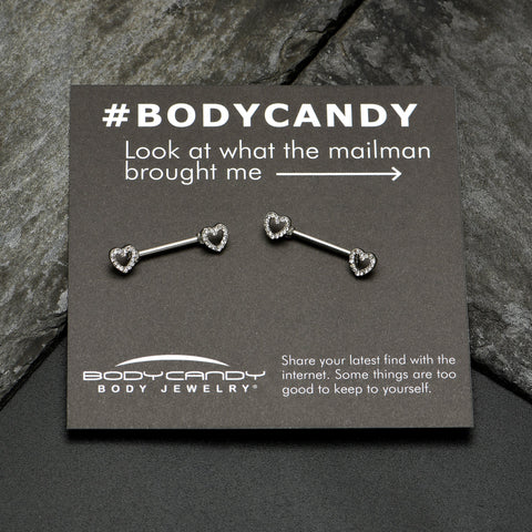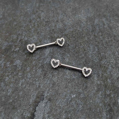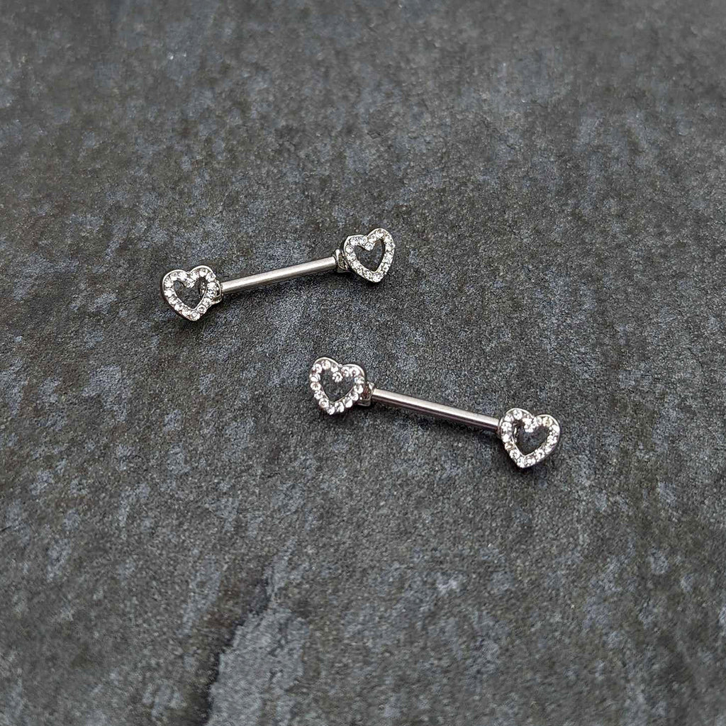 Keep your heart open and the world will notice - like on this 14 gauge nipple jewelry! It's made with 14mm durable 316L surgical grade stainless steel straight barbells. Each of the ends features a hollow heart charm, with the hearts paved with clear gems. The hearts are open at the centers for an airy look. For the incurable romantic, these understated valentine's nipple piercing rings are sure to make you fall in love! Sold as a set of two.Specifications