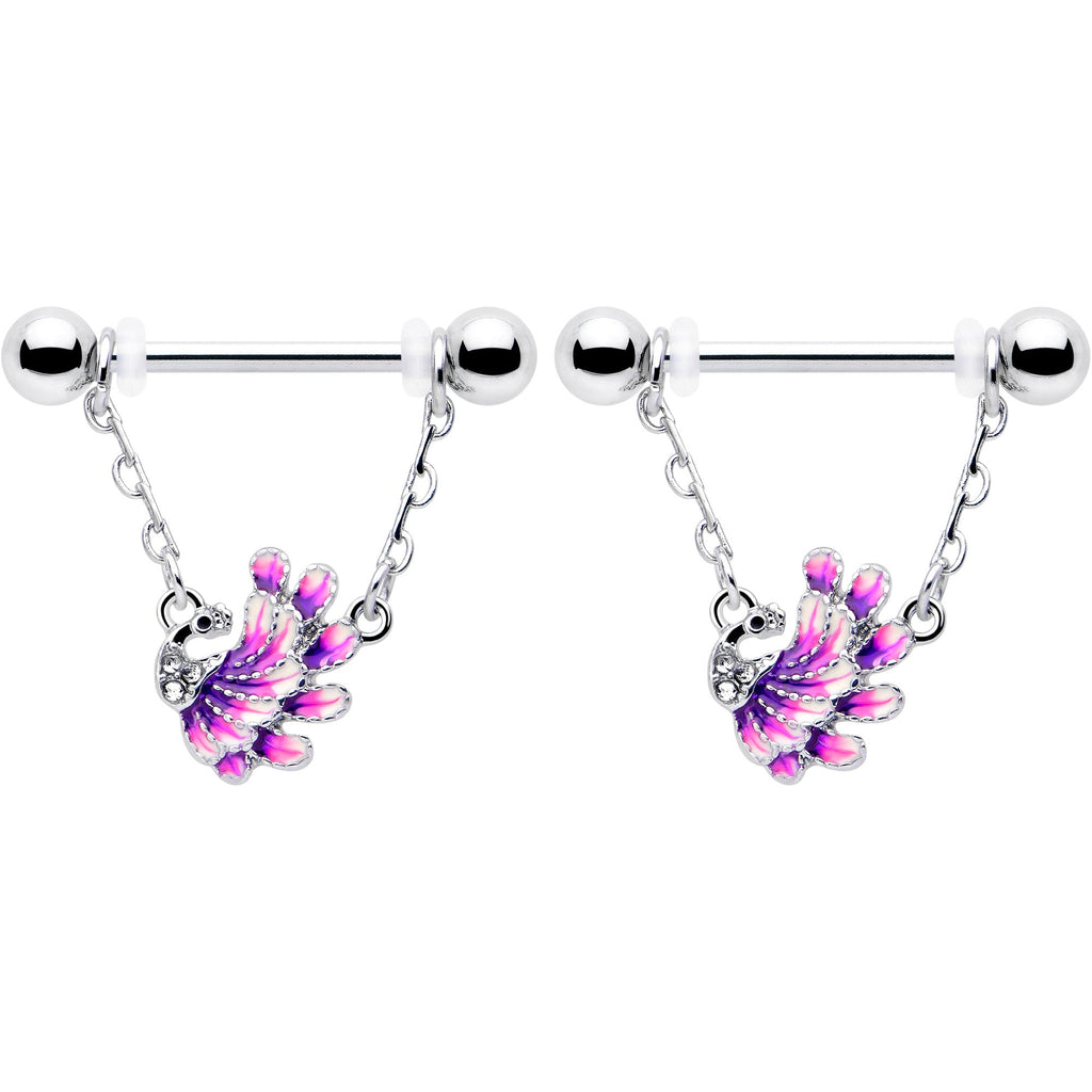 Feel as pretty as a peacock with this 14 gauge nipple jewelry. It is made with 14mm durable 316L surgical grade stainless steel straight barbells with 5mm ball ends. Each barbell supports a double length of matching chain that supports a peacock charm with clear gem embellishments. . The peacocks are further embellished with feathers inlaid in pink, purple, and white as well as clear gem embellishments. You will totally want to shake your tail feathers when you are rocking these precious, purple peacock nipple piercing rings. Sold as a set of two.Specifications