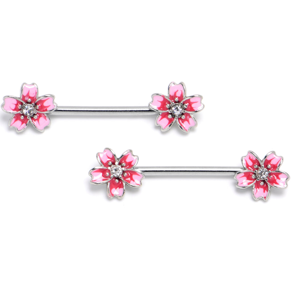 Look as perfectly pink as you could want with this 14 gauge floral nipple jewelry. It is made with 14mm durable 316L surgical grade stainless steel straight barbells. Each of the ends features a flower charm, inlaid in shades of pink and featuring clear gems at the centers. They are further embellished with textured detailing around the centers. Get in the pink with these colorfully floral nipple piercing rings. Sold as a set of two.Specifications