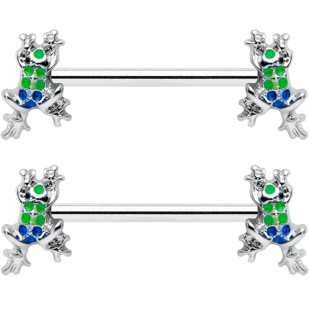 The frogs on this 14 gauge nipple jewelry are adorably dotty! It's made with 14mm durable 316L surgical grade stainless steel straight barbells. Each of the ends features a frog charm, with clear gem embellishments. The frogs are further embellished with blue and green polka dots for a look that's both whimsical and colorful. These frogs are freaking fantastic! Sold as a set of two.
