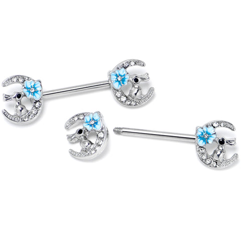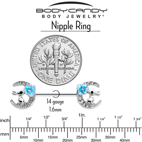 14 Gauge 9/16 Clear Gem Rabbit On Moon Flower Blue Nipple Ring Set
