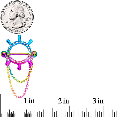 Pull the anchor - it's a beautiful day for sailing and these 14 gauge nipple shields are hot! They're made with 14mm rainbow plated over 316L surgical grade stainless steel straight barbells with 5mm ball ends. The shield portion is made in matching rainbow colors and shaped like a ship's steering wheel, with small clear gems set all around the center. This nipple jewelry is further embellished by a double loop of dangling chain. With these in your nipple piercings, you'll be aching to get out on the water! Sold as a set of two.Specifications