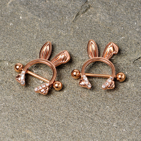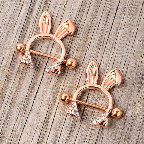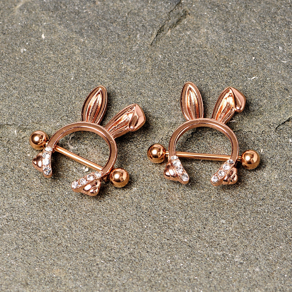 14 Gauge 9/16 Clear Gem Rose Gold Tone Bunny Ear Headphones Nipple Shield Set