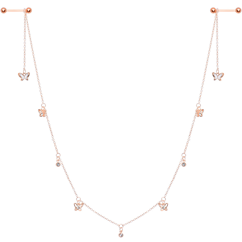 14 Gauge 9/16 Clear Gem Rose Gold Tone Butterfly Dangle Nipple Chain