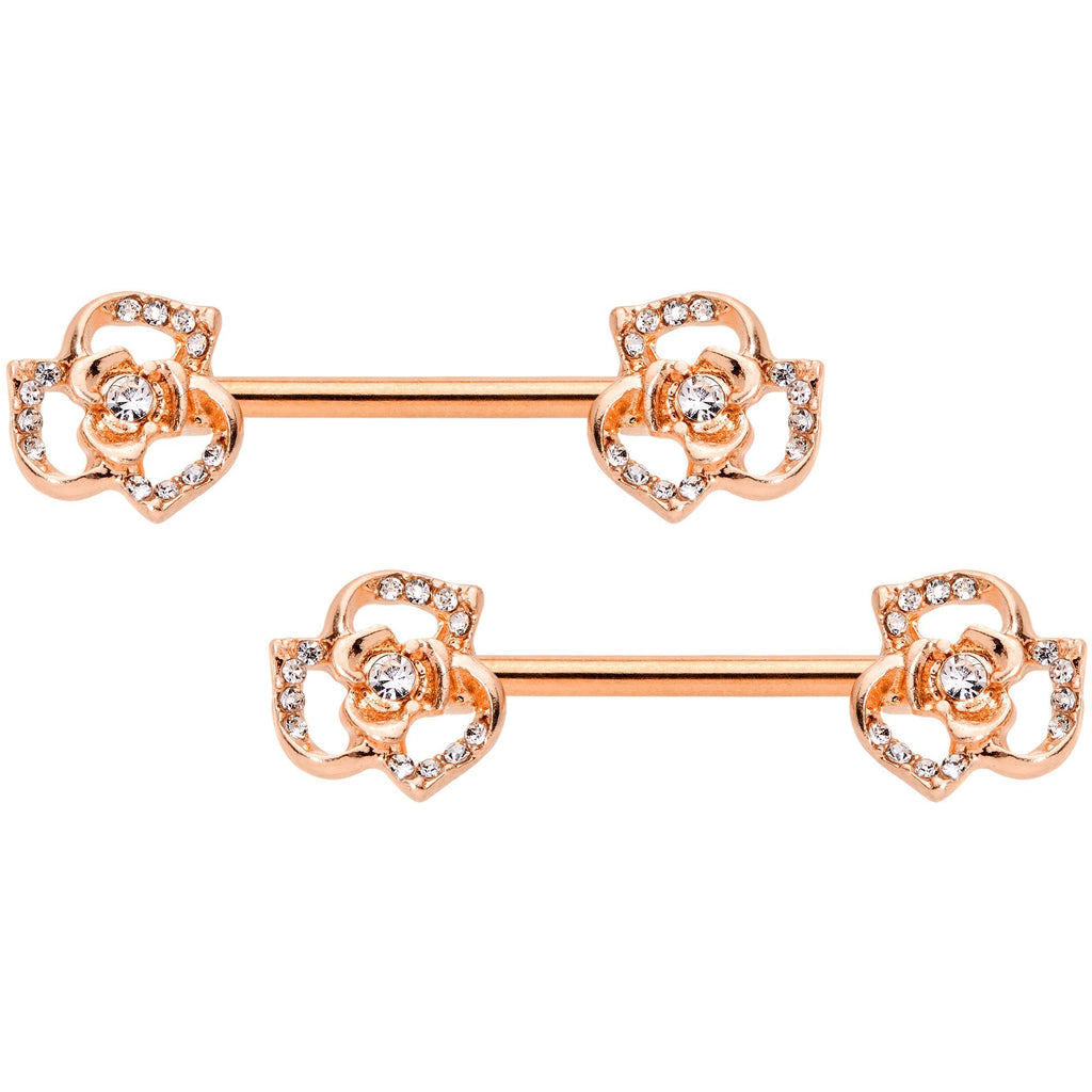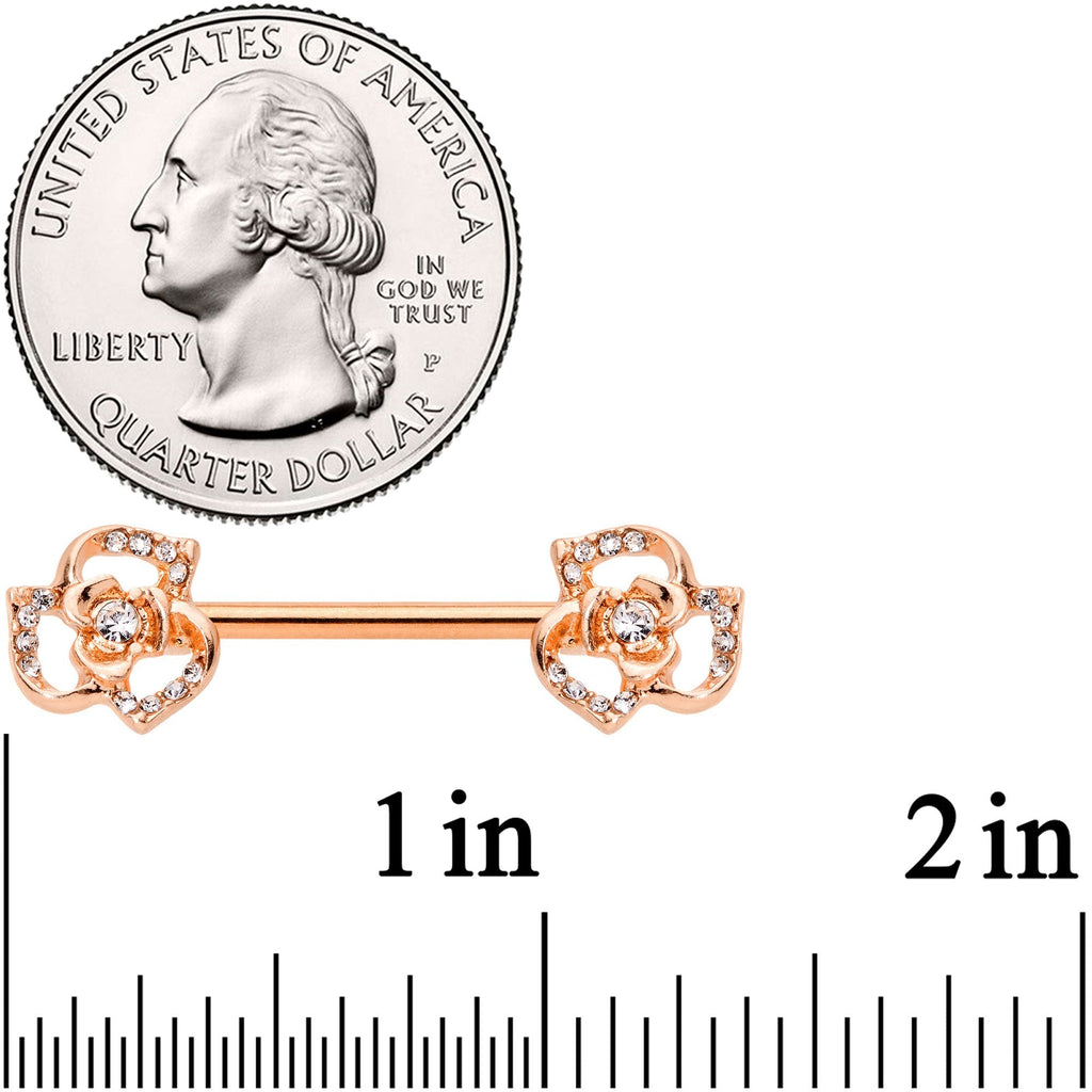 14G 9/16 Clear Gem Rose Gold Tone Flower Barbell Nipple Ring Set