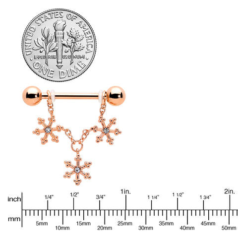The snowflakes on this 14 gauge nipple jewelry won't melt, but they just might melt your heart! It's made with 14mm wearable length rose gold tone PVD over 316L surgical grade stainless steel straight barbells with 5mm ball ends. They each feature a length of matching chain, supporting a trio of snowflake charms, with textured detailing and clear gems set at the center. How could you leave them out in the cold? Sold as a set of two.Specifications
