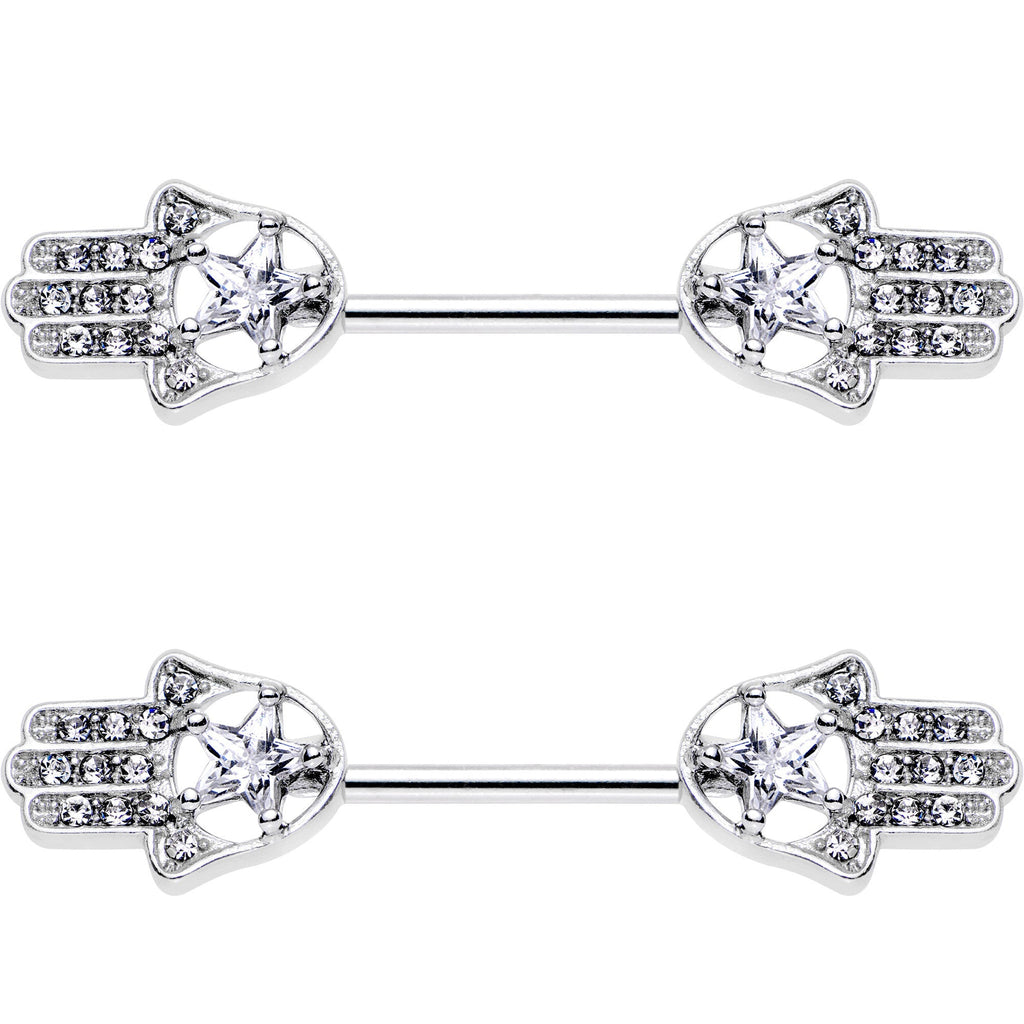 14G 9/16 Clear Gem Star Hamsa Hand Barbell Nipple Ring Set