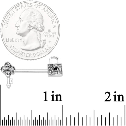 Some things are just too good to be shared like these 14 gauge nipple piercings! They're made with 14mm durable 316L surgical grade stainless steel straight barbells. One end features an old-fashioned style key set with clear gems and detail around the edges. The other end is a tiny padlock, also set with clear gems, and featuring a tiny black embellishment at its center to stand in for the keyhole. With body jewelry that looks this good, you'll want to lock it away and keep it all to yourself! Sold as a set of two.Specifications