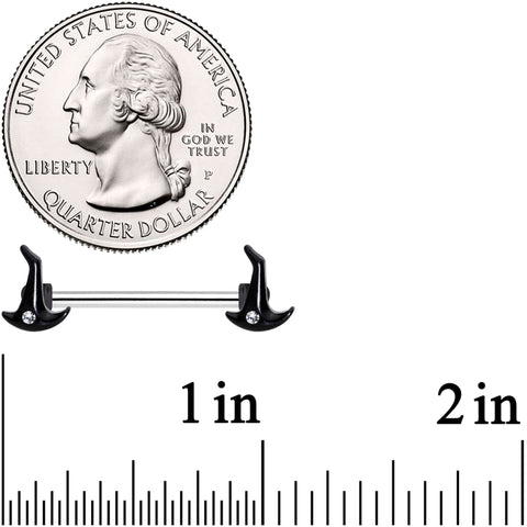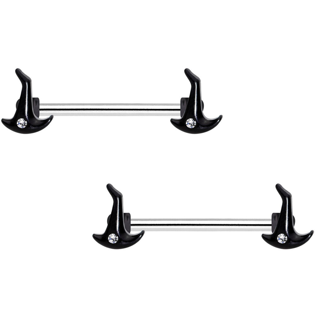 Show off your dark side anytime you like when you wear these 14 gauge nipple piercings with spooky Halloween style. Made with 14mm durable 316L surgical grade stainless straight barbells, this dangle nipple jewelry features black witch hat ends set with clear gems. This set of barbell nipple rings is sold as a set of two.Specifications