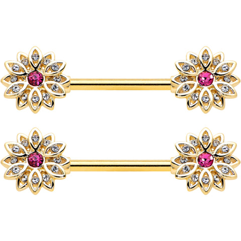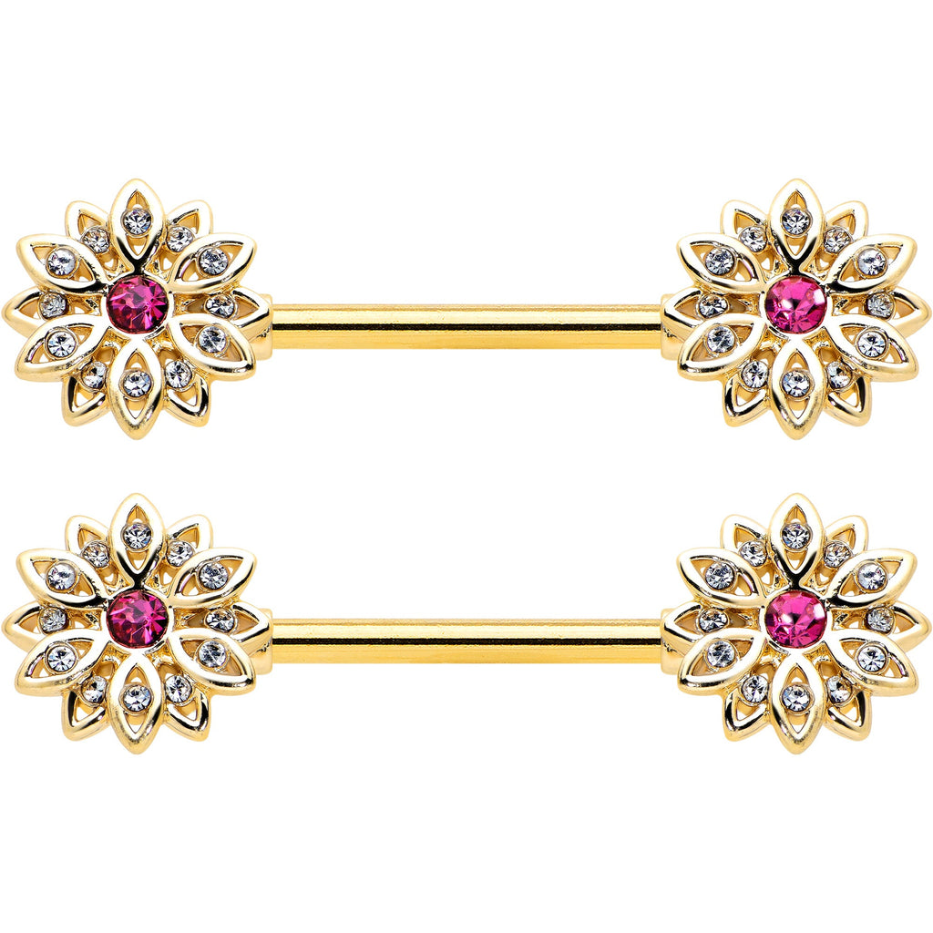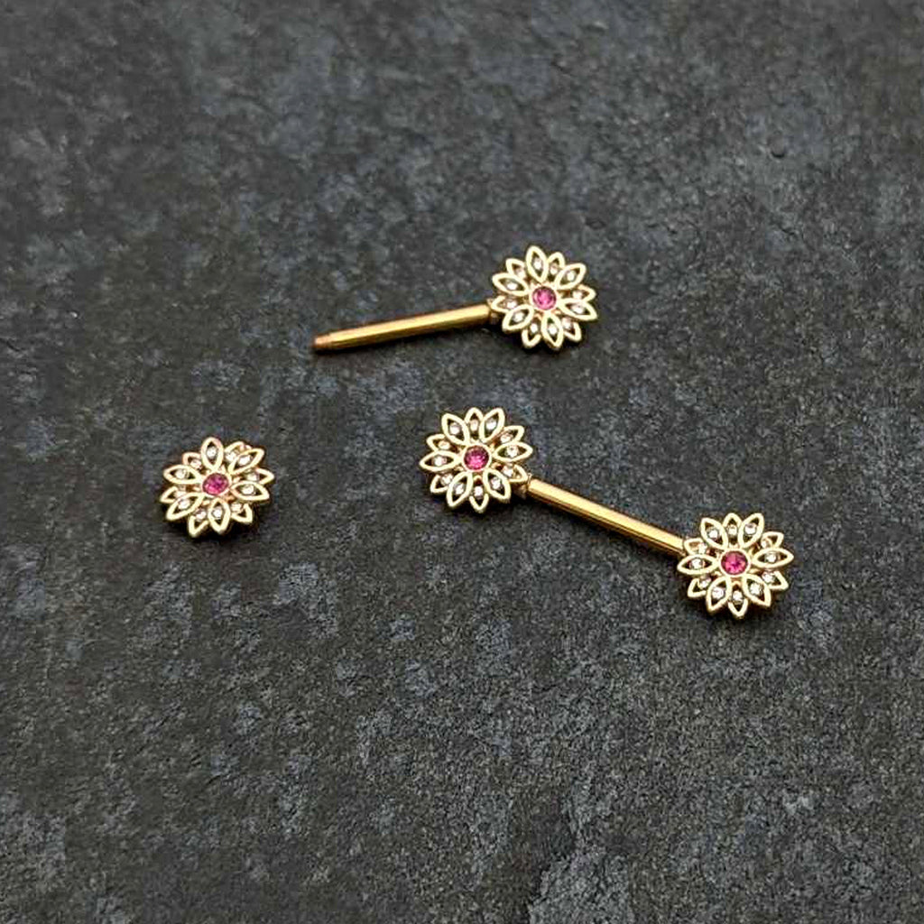 Some flowers are meant to be stars, like this 14 gauge nipple jewelry! It's made with 14mm gold tone PVD over 316L surgical grade stainless steel straight barbells. Each of the ends features a detailed flower charm, with petals paved with clear gems and the flower is set at the center with a pink gem for stunning color contrast. Let your piercings bloom like the stars they are when you're rocking these striking starry flower nipple piercing rings. Sold as a set of two.Specifications