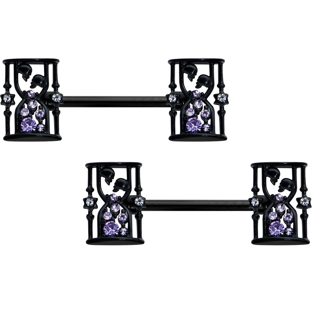 It's time....to add some dark elegance to your look with this 14 gauge nipple jewelry! It's made with 14mm black PVD over 316L surgical grade stainless steel straight barbells. Each of the ends features an hourglass charm, with purple gems for the sand. They're embellished with two black skulls one on each side.The hourglasses are also embellished with a pair of stars with clear gem centers. You'll want these gothic beauties in your nipple piercings all the time! Sold as a set of two.Specifications
