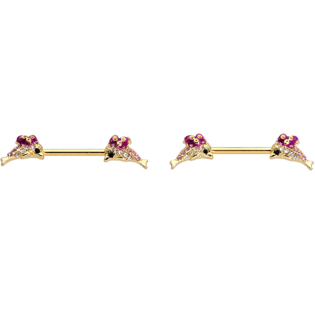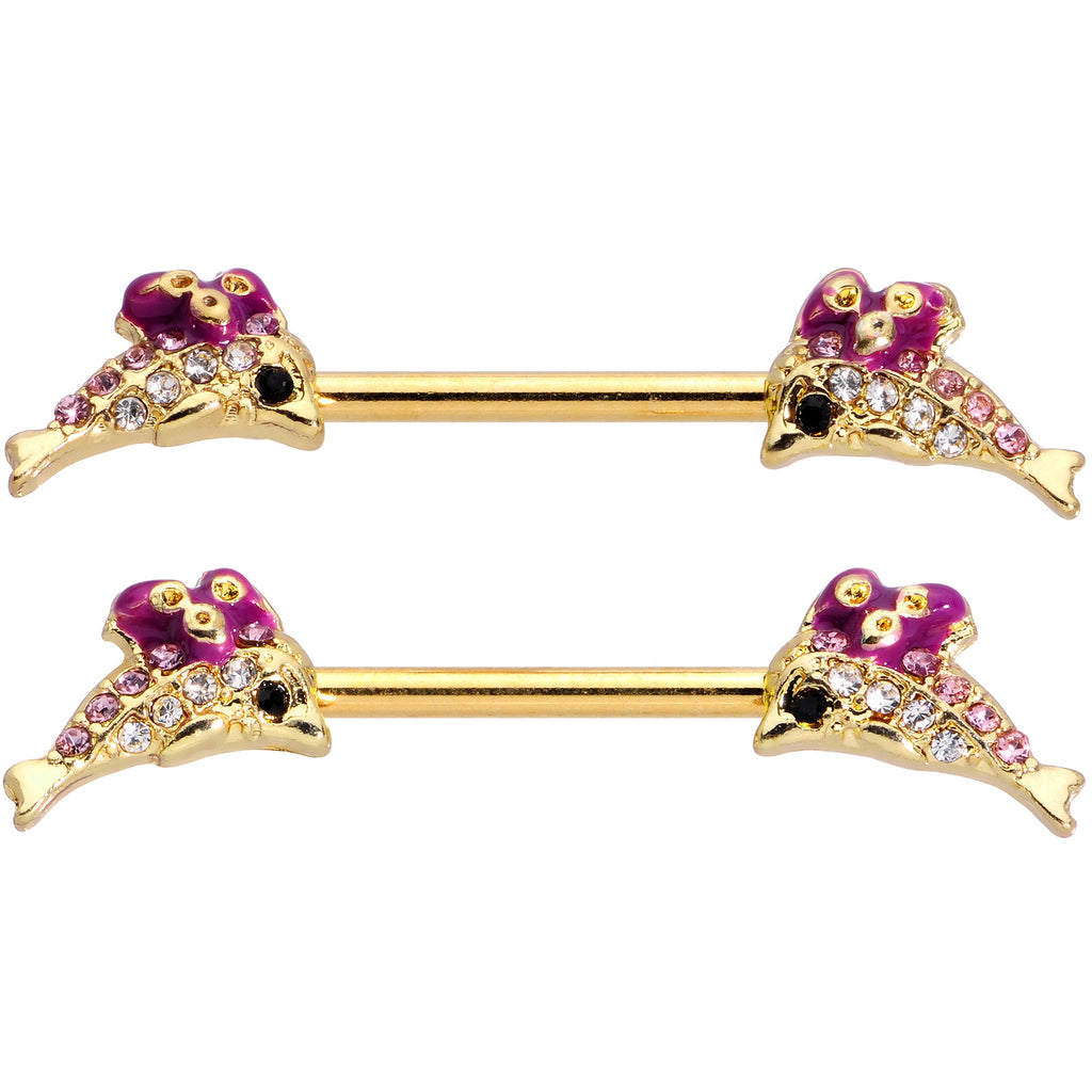 These dolphins are feeling extra pretty and you will too with this 14 gauge nipple jewelry! It's made with 14mm gold tone PVD over 316L surgical grade stainless steel straight barbells. The ends each feature a leaping dolphin charm set with light purple and clear gems for an eye-catching look and the dolphins are each wearing a purple bow for a cohesive and colorful appearance. You'll be feeling fabulous with these nifty, nautical barbell nipple rings! Sold as a set of two.