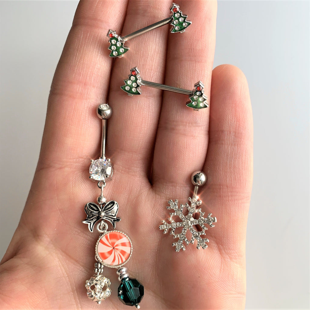 Deck your holes with holiday jewelry! These 14 gauge nipple rings are made with 14mm durable 316L surgical grade stainless steel. The ends feature little green Christmas tree charm ends set with clear gems to give them an appearance of being hung with holiday ornaments. Each tree is crowned with a small red gem, for added holiday color as well as giving the look a real X-mas tree would have. Let your nipple piercings feel the festive holiday spirit with these colorful Christmas trees! Sold as a set of two.Specifications
