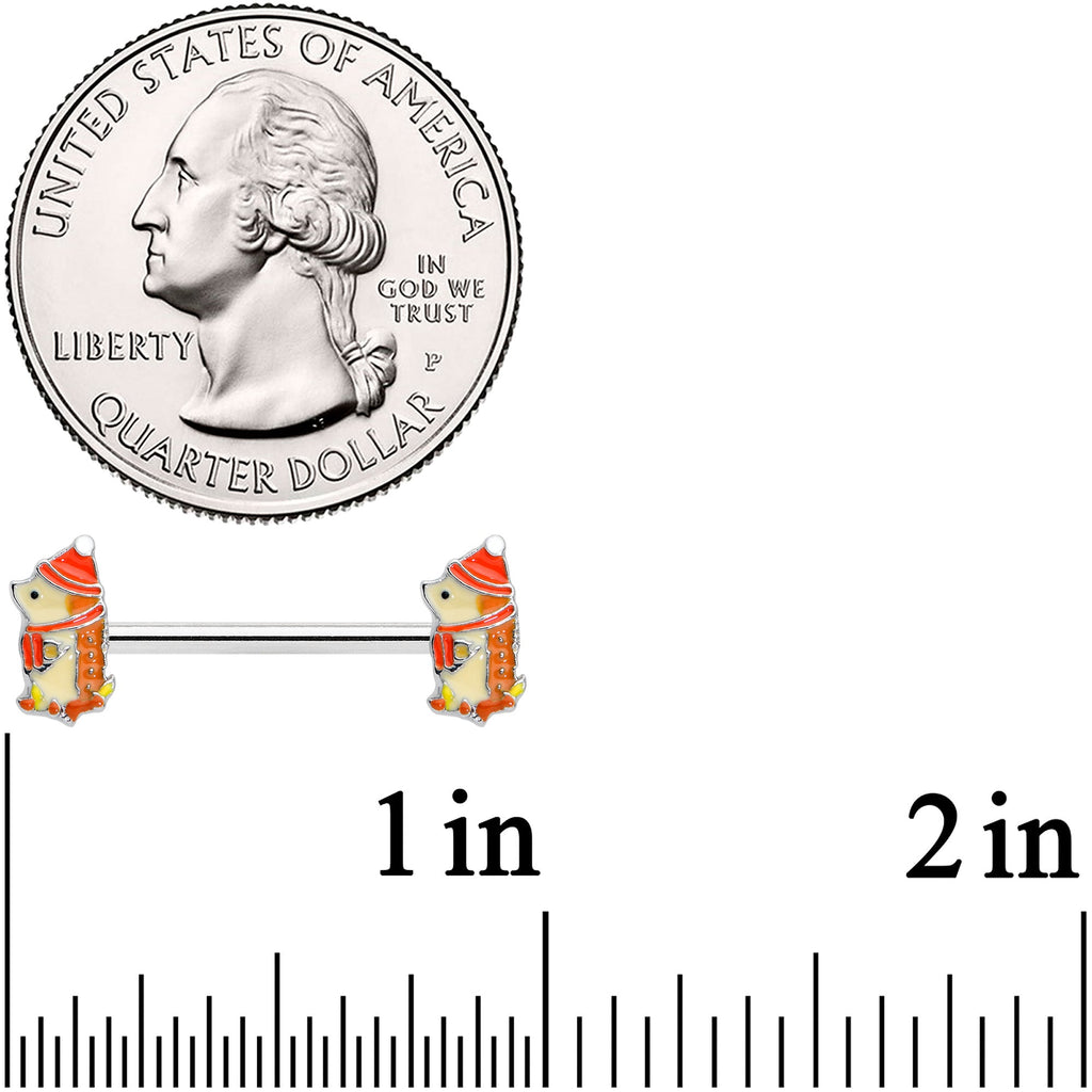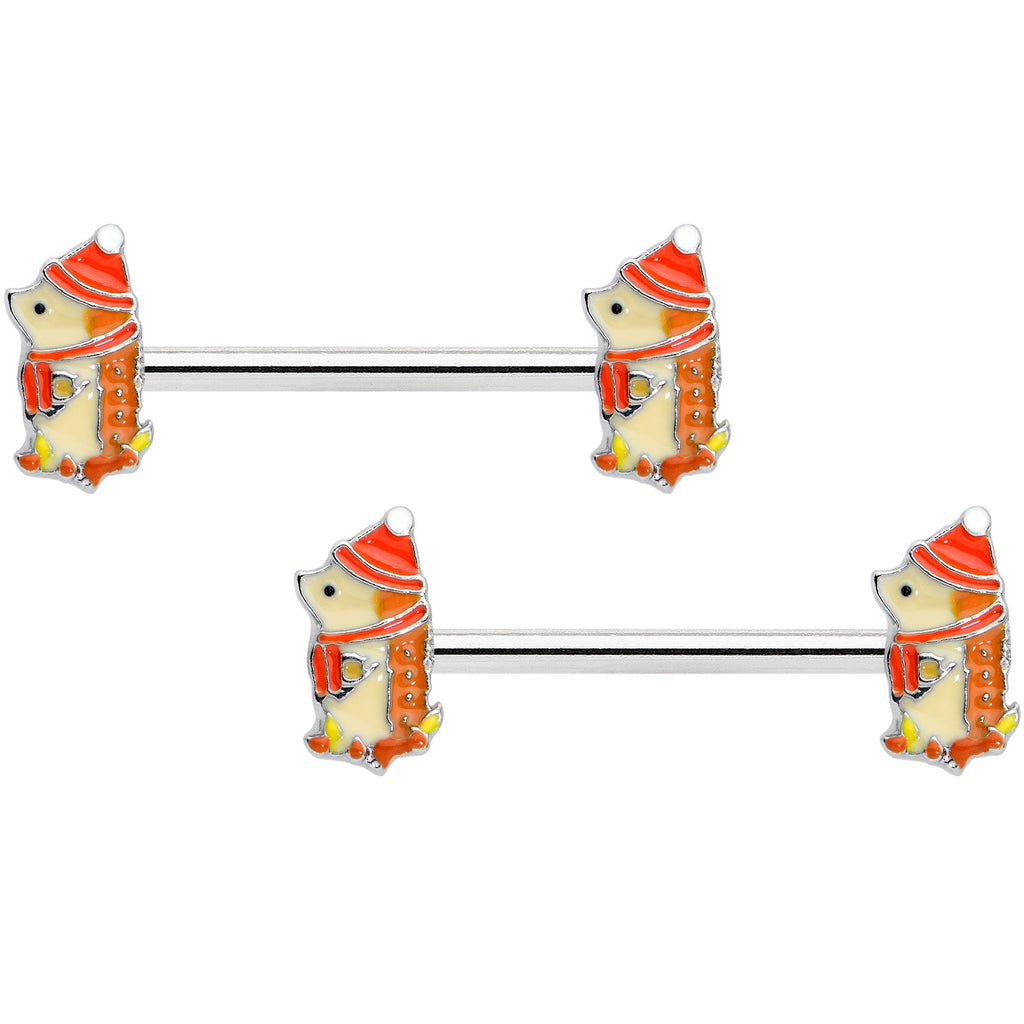 The spiky fellows on this 14 gauge nipple jewelry are all bundled up for the winter! It's made with 14mm durable 316L surgical grade stainless steel straight barbells. Each of the ends features a hedgehog charm, with a white body and tan snout. The hedgehogs are each bundled up in an orange hat and scarf to keep the chill away. These sweet little hedgehog nipple piercing rings are sure to warm your heart! Sold as a set of two.Specifications