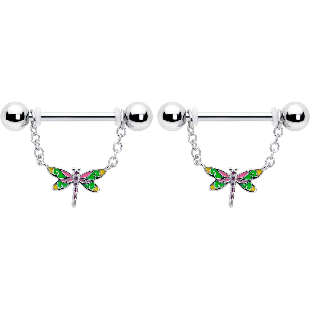 14 Gauge 9/16 Dragonfly Colors Chain Dangle Nipple Ring Set