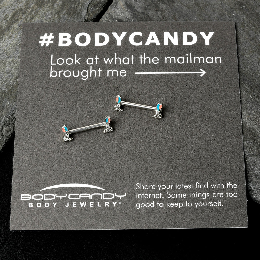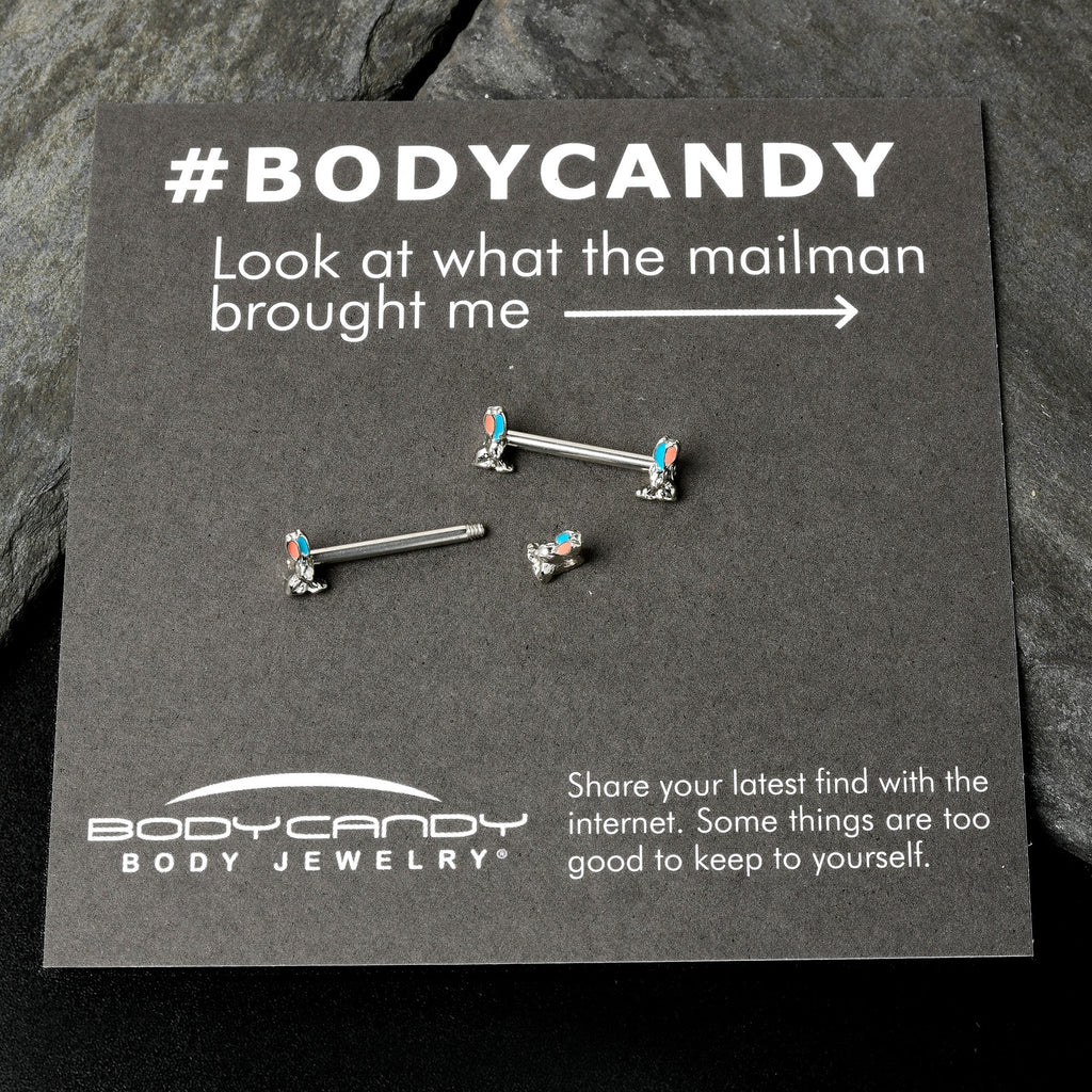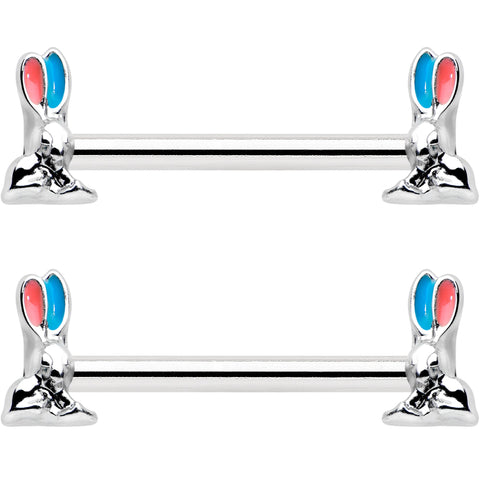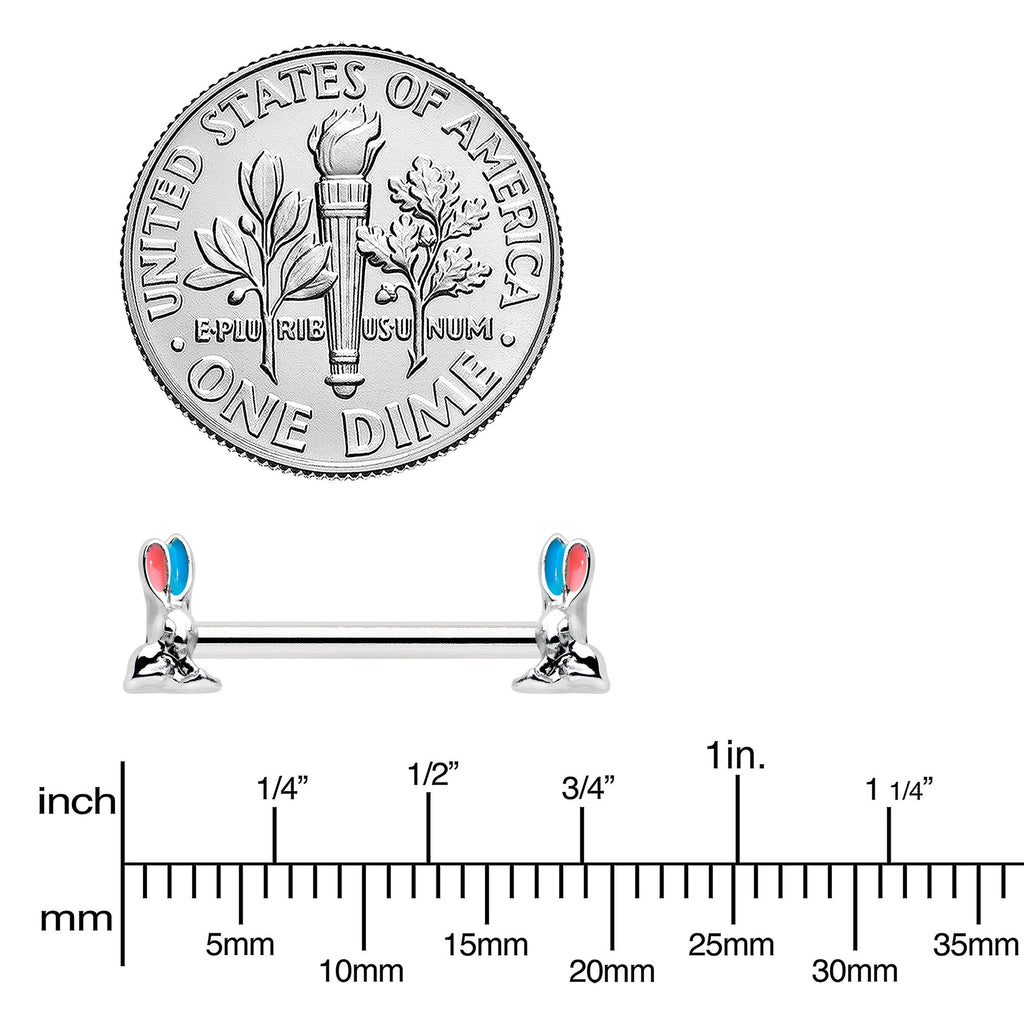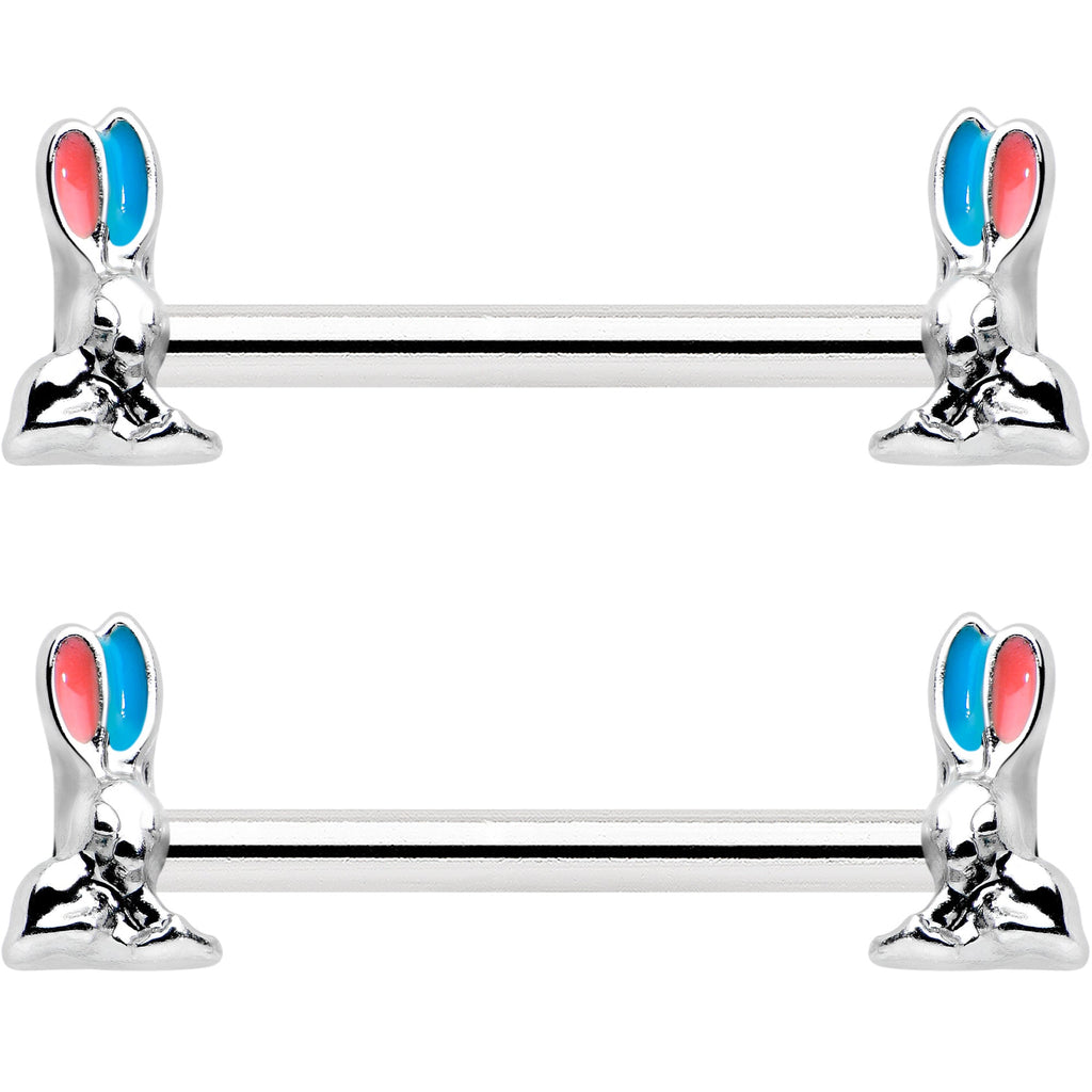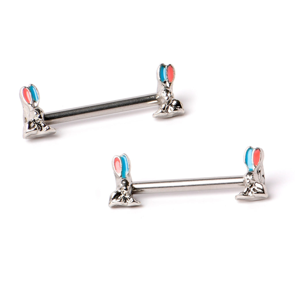 Hop into holiday style with this 14 gauge nipple jewelry! It's made with 14mm durable 316L surgical grade stainless steel straight barbells. Each of the ends features an Easter bunny charm. The bunnies are embellished with red inlay in one ear and blue inlay in the other ear, for a festive splash of color you can't ignore. Go down a rabbit hole of color and fashion with these festive Easter nipple piercing rings. Sold as a set of two.Specifications