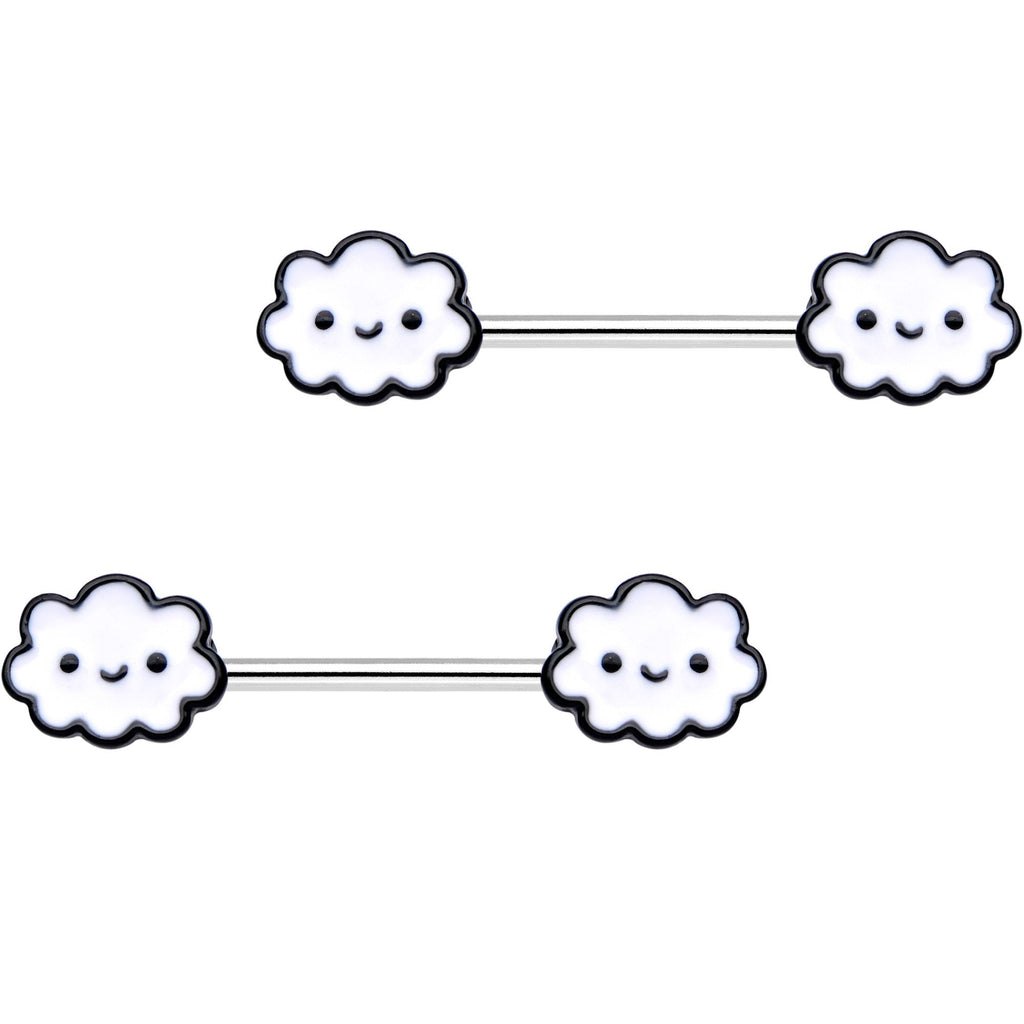 If you're always looking for the rainbow after the rain then you will love this pretty 14 gauge pair of nipple barbells. Made with 14mm durable 316L surgical grade stainless steel straight barbells, this nipple jewelry set features happy fluffy white cloud ends that will remind you that a couple of clouds don't mean a rainy day! This pair of cloud nipple piercings is sold as a set of two for you.