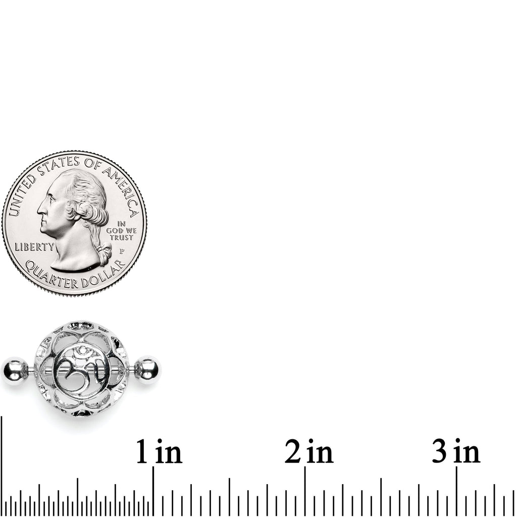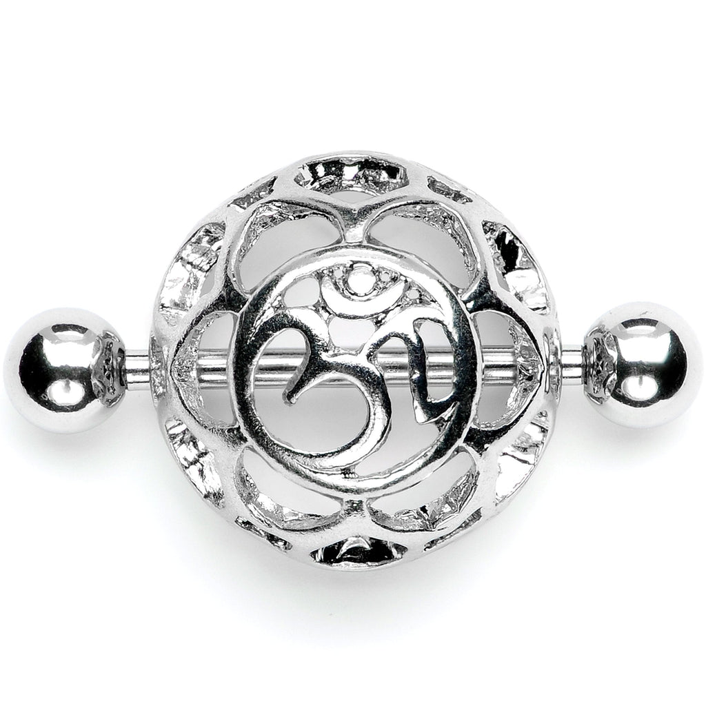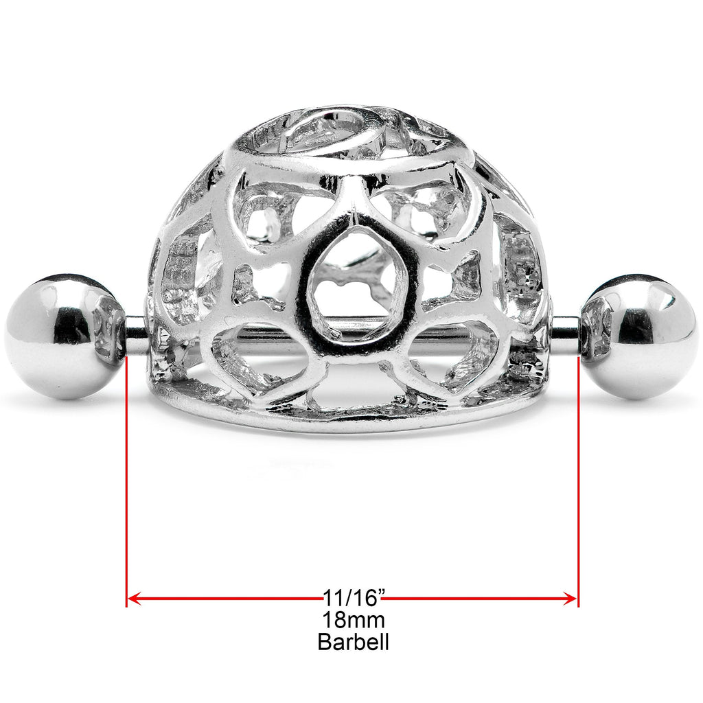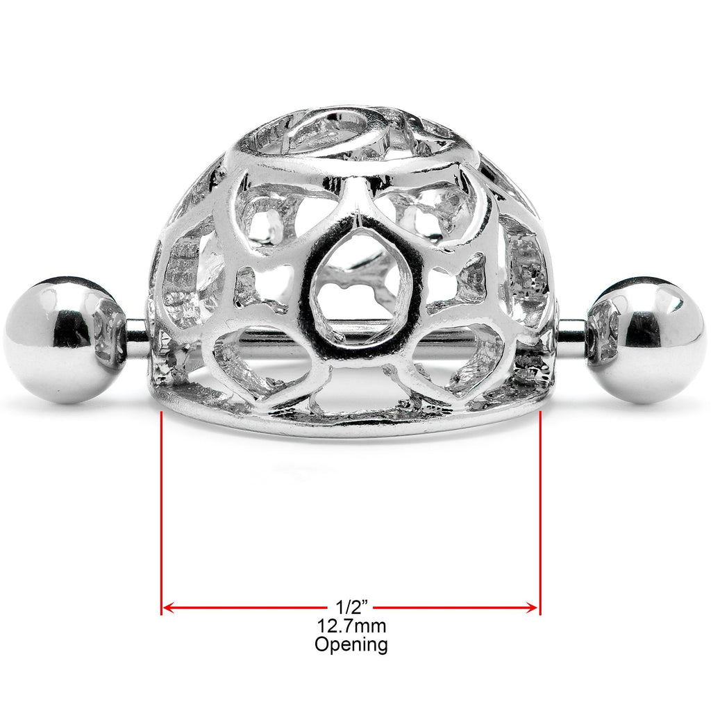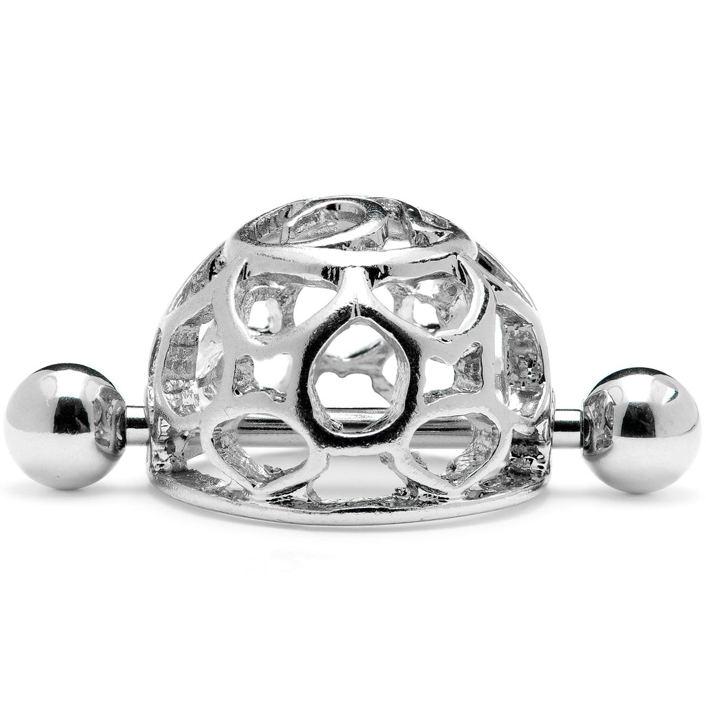 When all the parts work together, the final product can be something amazing! And that's exactly what's happening with these 14 gauge nipple piercings. Made with 14mm durable 316L surgical grade stainless steel straight barbells, they feature dome-shaped shield charms comprised of varying framework geometric shapes. The contrast between the different parts make for a stunning final piece and with a 10mm width and rise of 8mm, they're comfortable as well as gorgeous. Sold as a pair.