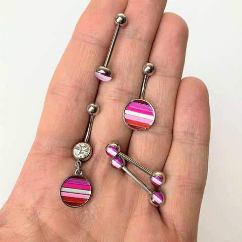 Wear your pride on your sleeve...or in your nipple piercings with this 14 gauge nipple jewelry. It's made with 14mm durable 316L surgical grade stainless steel straight barbells. The 6mm ball ends are inlaid on the front with the lesbian pride flag. Whether you're an ally or want the world to see your pride, meet the subject head-on with this front-facing pride-themed nipple jewelry that supports equal rights for all! Sold as a set of two.Specifications