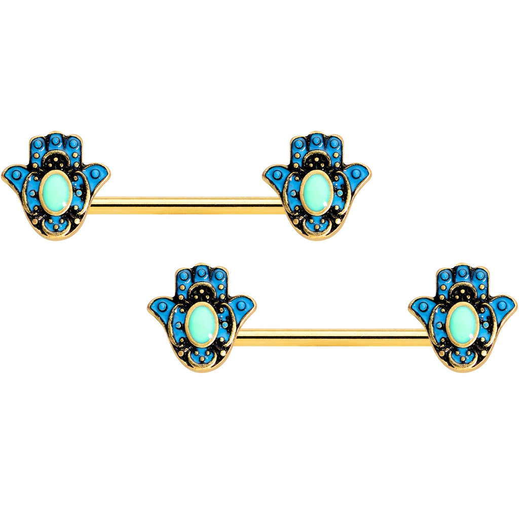 14G 9/16 Gold Tone Aqua Ornate Hamsa Hand Barbell Nipple Ring Set