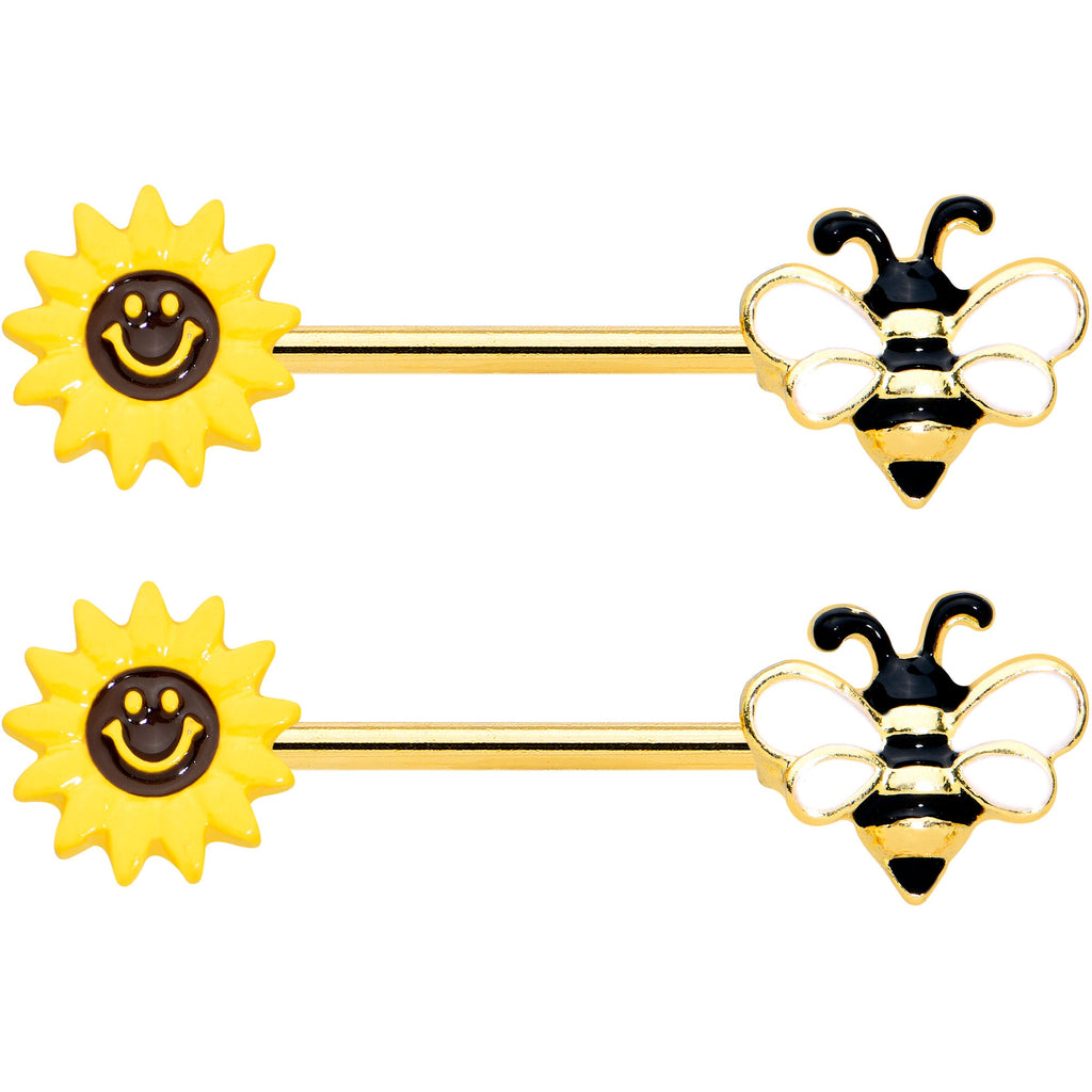 This 14 gauge nipple jewelry will have you smiling like this sunflower! It's made with 14mm gold tone plated over 316L surgical grade stainless steel straight barbells. One end features a bee charm, with black and golden stripes and white wings. The other end features a sunflower charm, with a big smiling face at its center. You'll be bee buzzing with smiles when you're rocking these cheerful, floral nipple rings! Sold as a set of two.Specifications