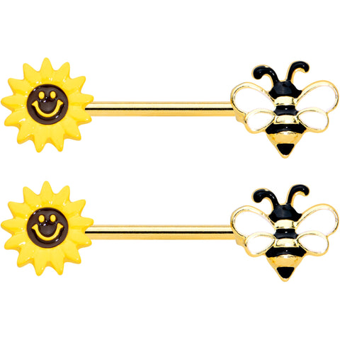 14 Gauge 9/16 Gold Tone Bee Smiley Sunflower Barbell Nipple Ring Set
