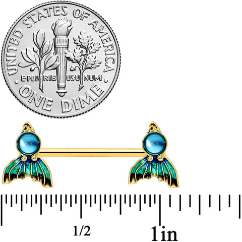 14 Gauge 9/16 Gold Tone Blue Green Mermaid Tail Barbell Nipple Ring Set