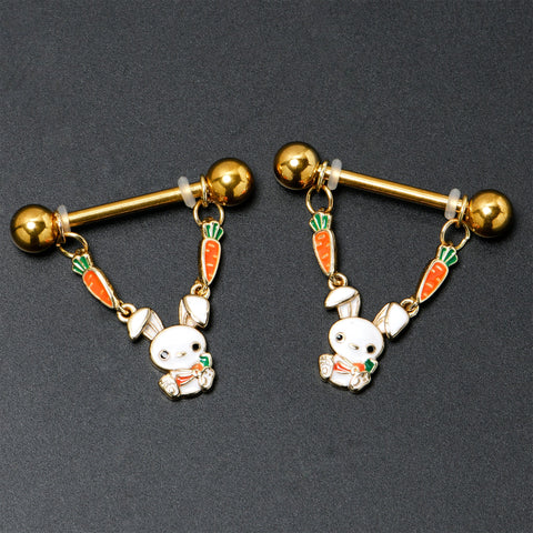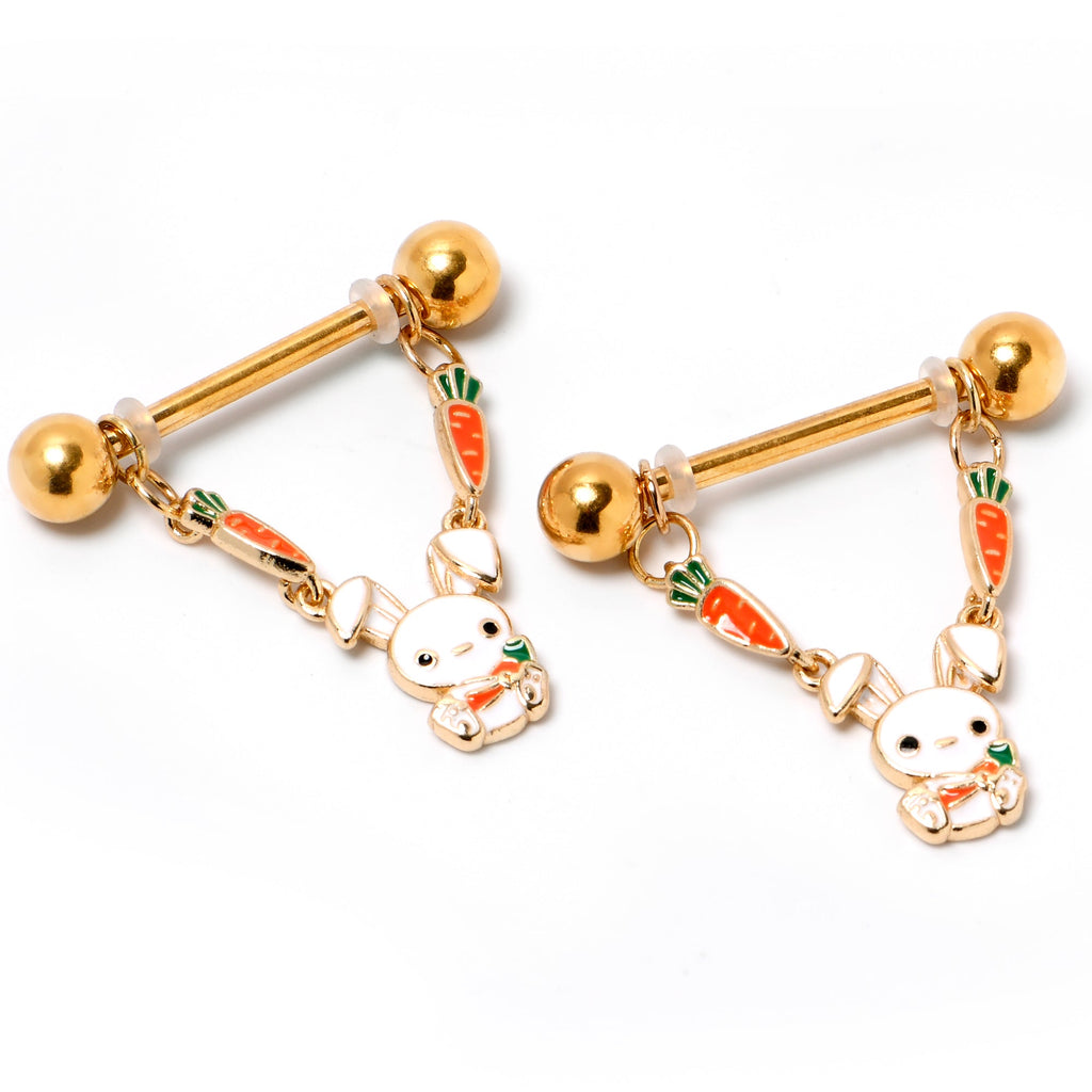 The Easter Bunny on this 14 gauge nipple jewelry is quite the little cutie. It is made with 14mm gold tone PVD over 316L surgical grade stainless steel straight barbells with 5mm ball ends. Each one features a dangle Easter Bunny charm, with the bunnies each cradling a carrot. The bunny rabbits are each set between a pair of carrot charms for a cohesive and eye catching look. The bunnies on these nipple piercing rings are ones you will want hanging around all year long. Sold as a set of two.Specifications