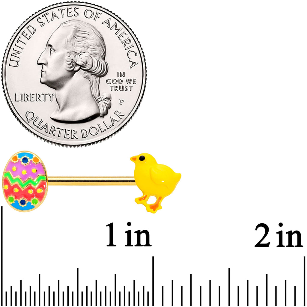 Get wild this Easter with this 14 gauge chick and egg nipple jewelry! It's made with 14mm gold tone PVD over 316L surgical grade stainless steel straight barbells. One end features a yellow Easter chick charm. The chicks are each embellished with a black eye and realistically orange legs and feet. The other end features an Easter egg charm, decorated with wild stripes of purple, green, orange, and blue. Hatch a colorful new look for Easter with these festive chick and egg nipple piercing rings! Sold as a set of two.Specifications