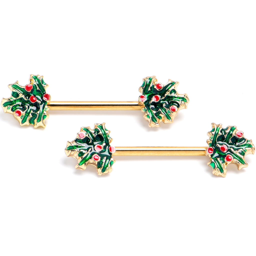 14 Gauge 9/16 Gold Tone Festive Holly Sprig Barbell Nipple Ring Set